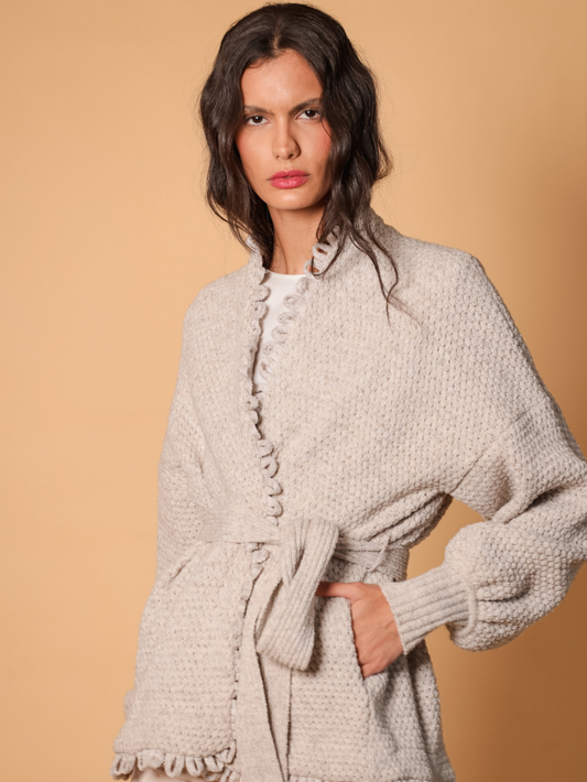 Cardigan em tricot texturizado com detalhe de roletes nas bordas e faixa para amarração na...