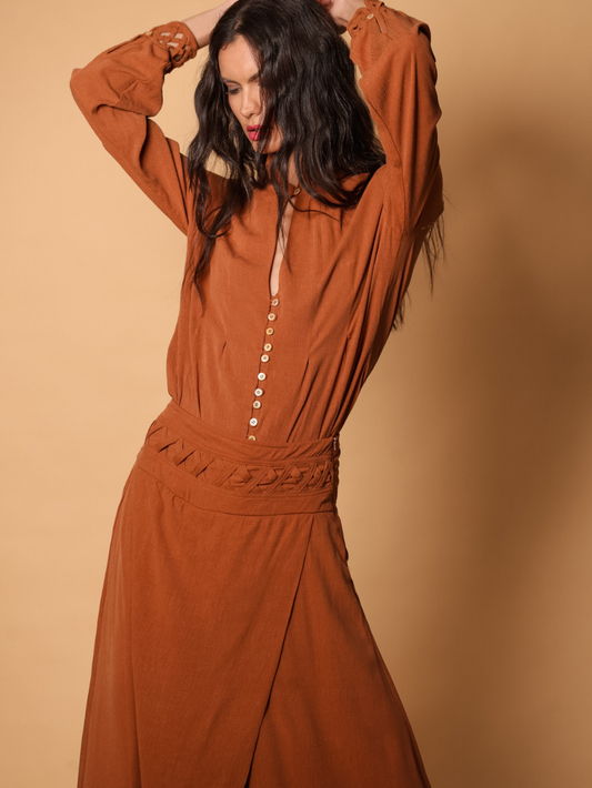 Vestido longo estilo chemise, com botões frontais e amarração ajustável na cintura. Confeccionado em renda...