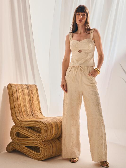 Calça ampla em modelagem wide-leg, em tecido tipo sarja com bordado floral. Possui cintura alta,...