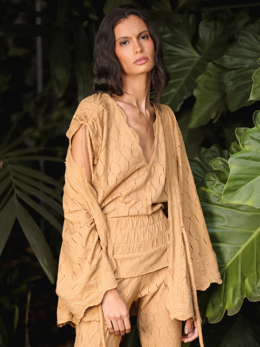 Kimono de modelagem reta com mangas amplas e aplicação trançada nos ombros. Possui textura artesanal...