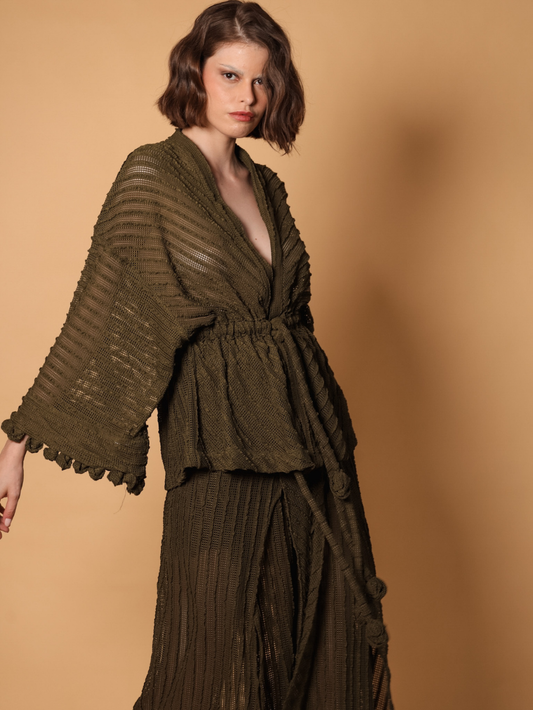 Kimono de tricot com padronagem em relevo e caimento solto. Possui mangas amplas com punhos...