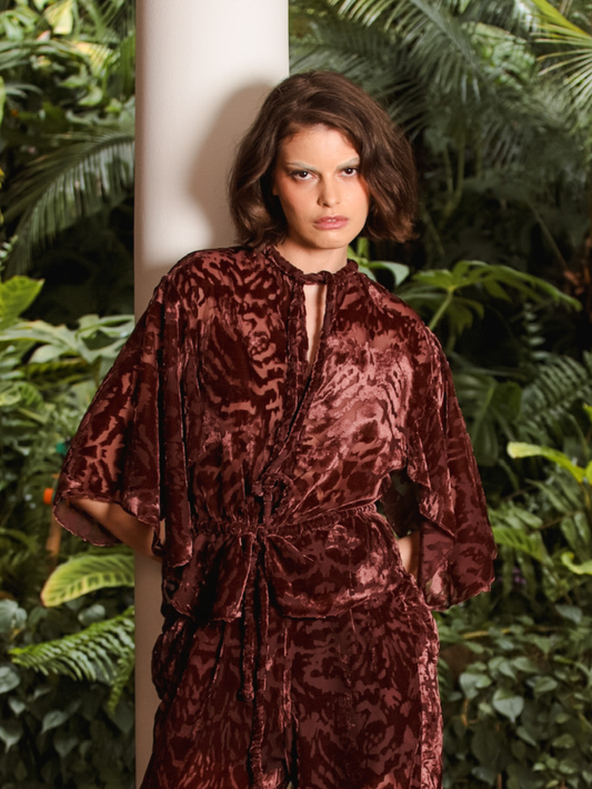 Kimono em tecido aveludado com padronagem listrada. Possui mangas amplas três quartos, decote em “V”...