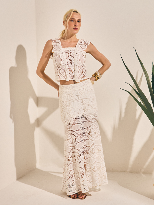 Saia midi em renda guipir cós estilo clochard com babado e amarração para acinturar a...