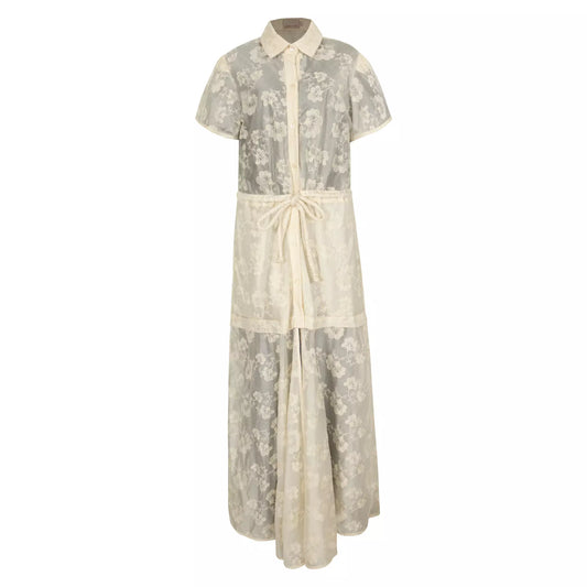 Vestido estilo chemise em tecido bordado. Apresenta comprimento midi, mangas curtas e pala larga de...