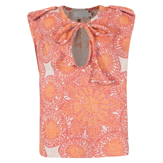 Regata de caimento reto em tecido estampado, com detalhe de cordão na gola para amarração....