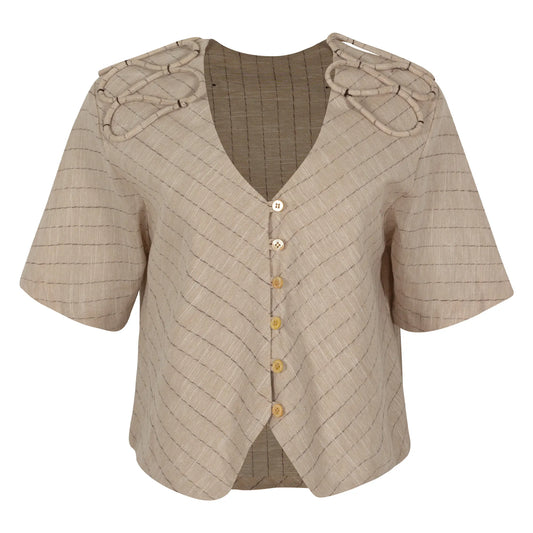 Blusa de manga curta, caimento reto e decote "V" em tecido listrado leve. Possui detalhes...