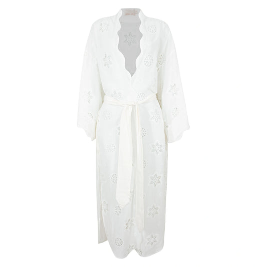 Kimono longo e amplo de manga longa em tecido bordado leve, possui bolsos e fendas...