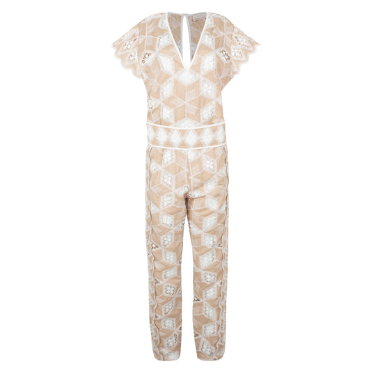 Macacão em tecido bordado leve com decote “V” e mangas curtas. A calça apresenta caimento...