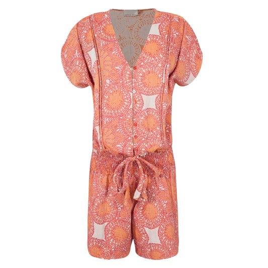 Macaquinho em tecido estampado, com decote "V" e manga curta. Possui fechamento frontal por botões...