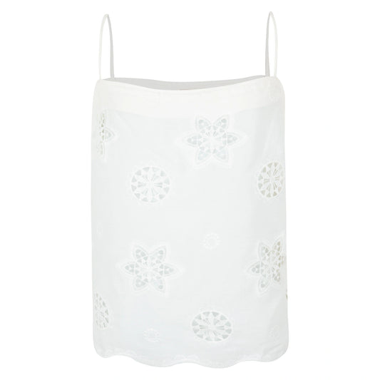 Regata de caimento reto em tecido bordado, leve com alças finas. Possui barra recortada acompanhando...