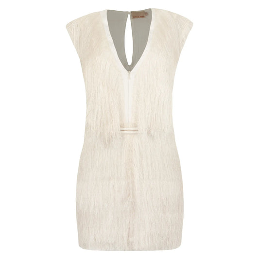 Vestido curto regata em tecido de franjas. Possui decote “V”, saia em camadas e recortes...