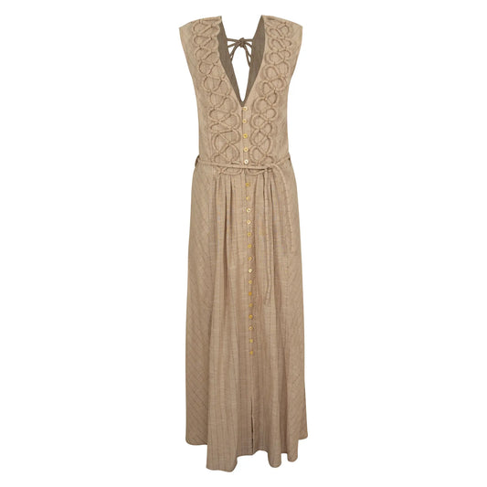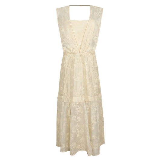 Vestido regata longo em tecido bordado. Apresenta pala larga de caimento reto com saia evasê...