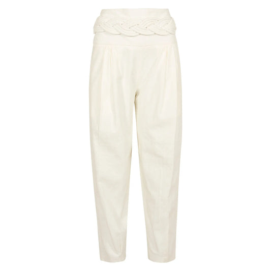 Calça de cintura média estilo cenoura em tecido leve de linho. Apresenta detalhes manuais trançados...
