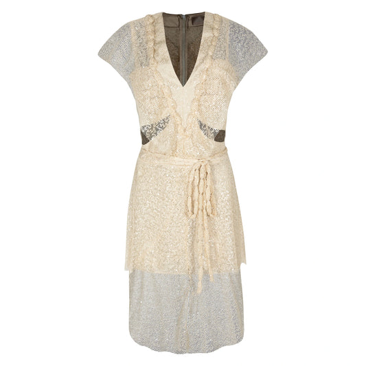 Vestido curto regata em tecido de tela com paetê. Apresenta recortes na região da cintura...
