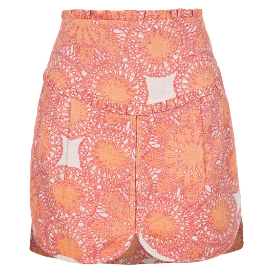 Saia curta de cintura alta em tecido estampado. Possui pala alta com detalhes manuais de...