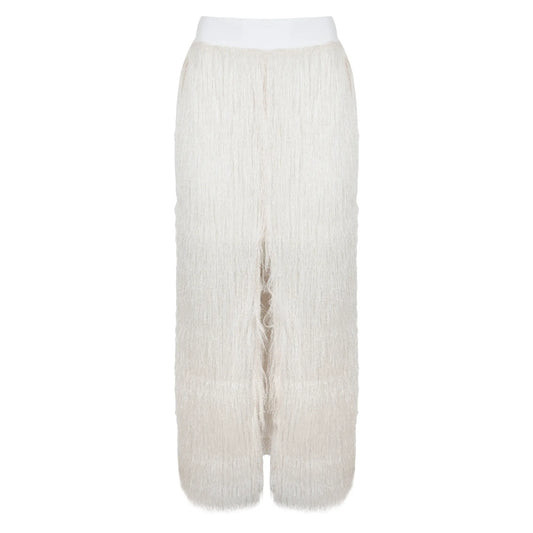 Saia midi, estilo lápis em tecido de franjas. Possui cintura alta e fenda frontal. ...