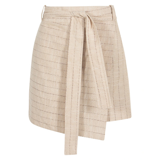 Shorts saia de cintura média e caimento reto em tecido listrado leve. Apresenta detalhe transpassado...