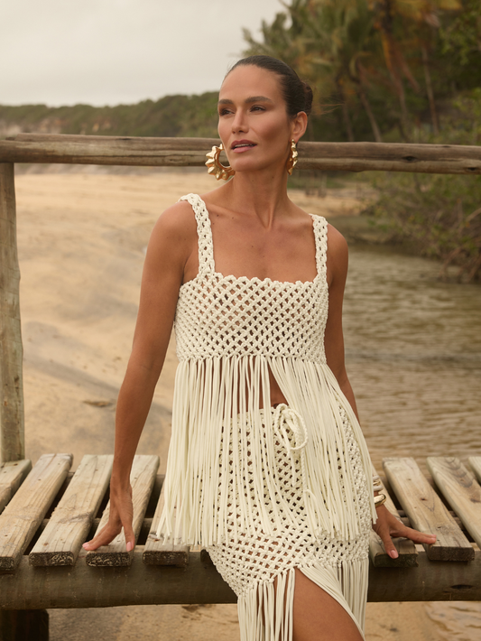Top em trama de macramê com acabamento em franjas. Modelagem ajusta ao corpo e reta...