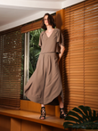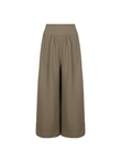 Calça de cintura alta com recorte curvado no cós. Possui modelagem ampla e reta, comprimento midi e barra larga estruturada, criando um caimento fluido.