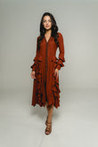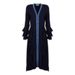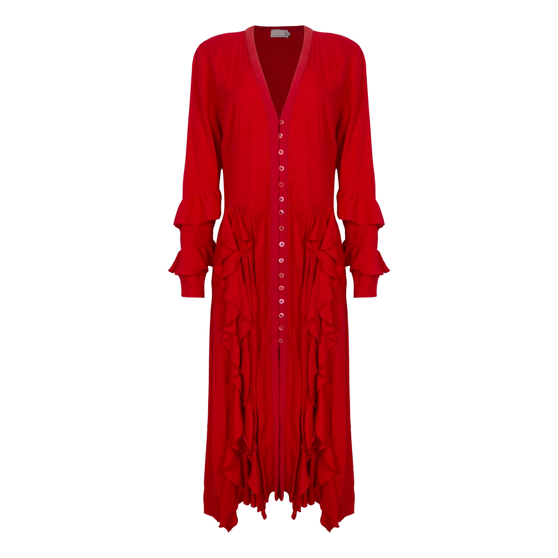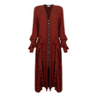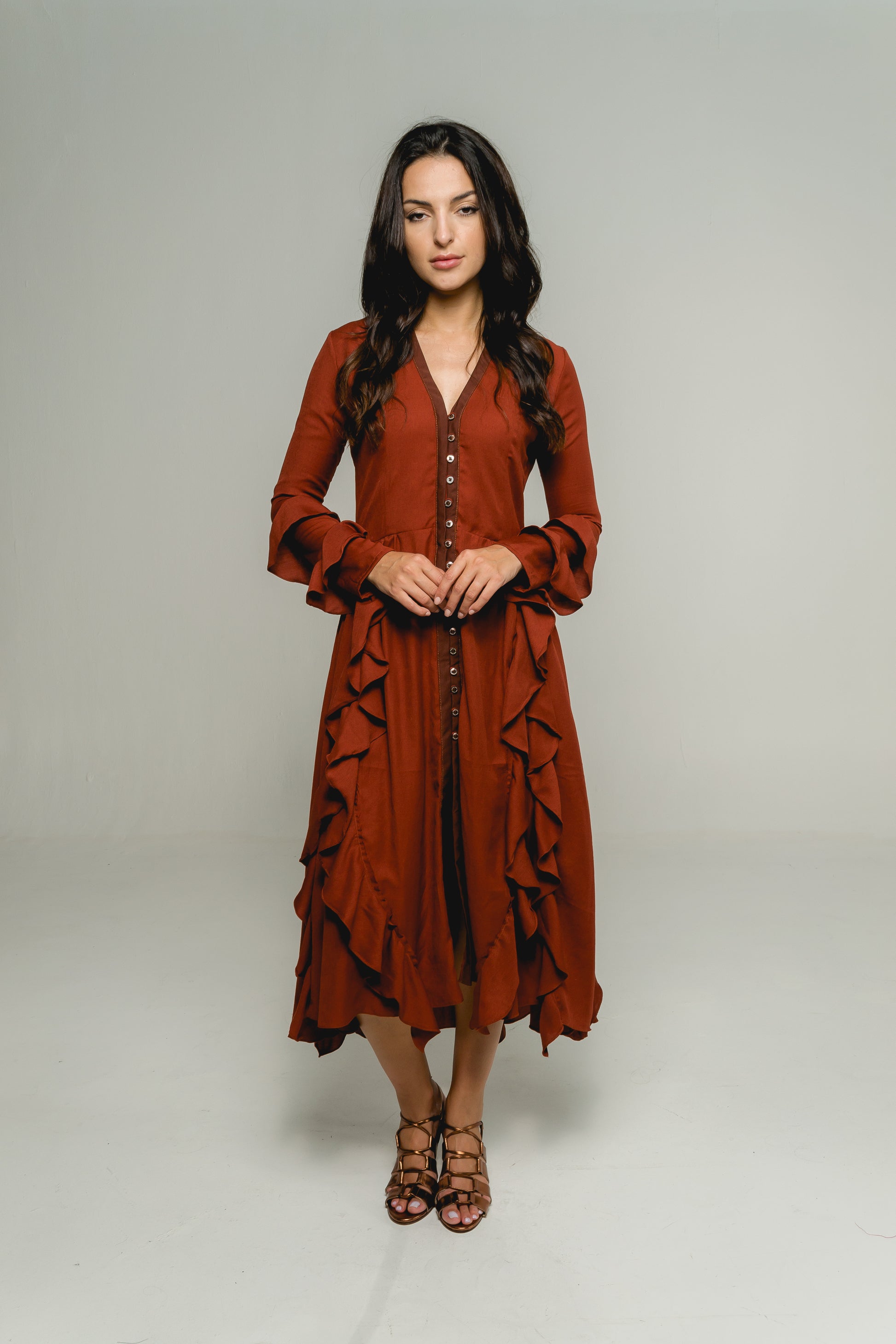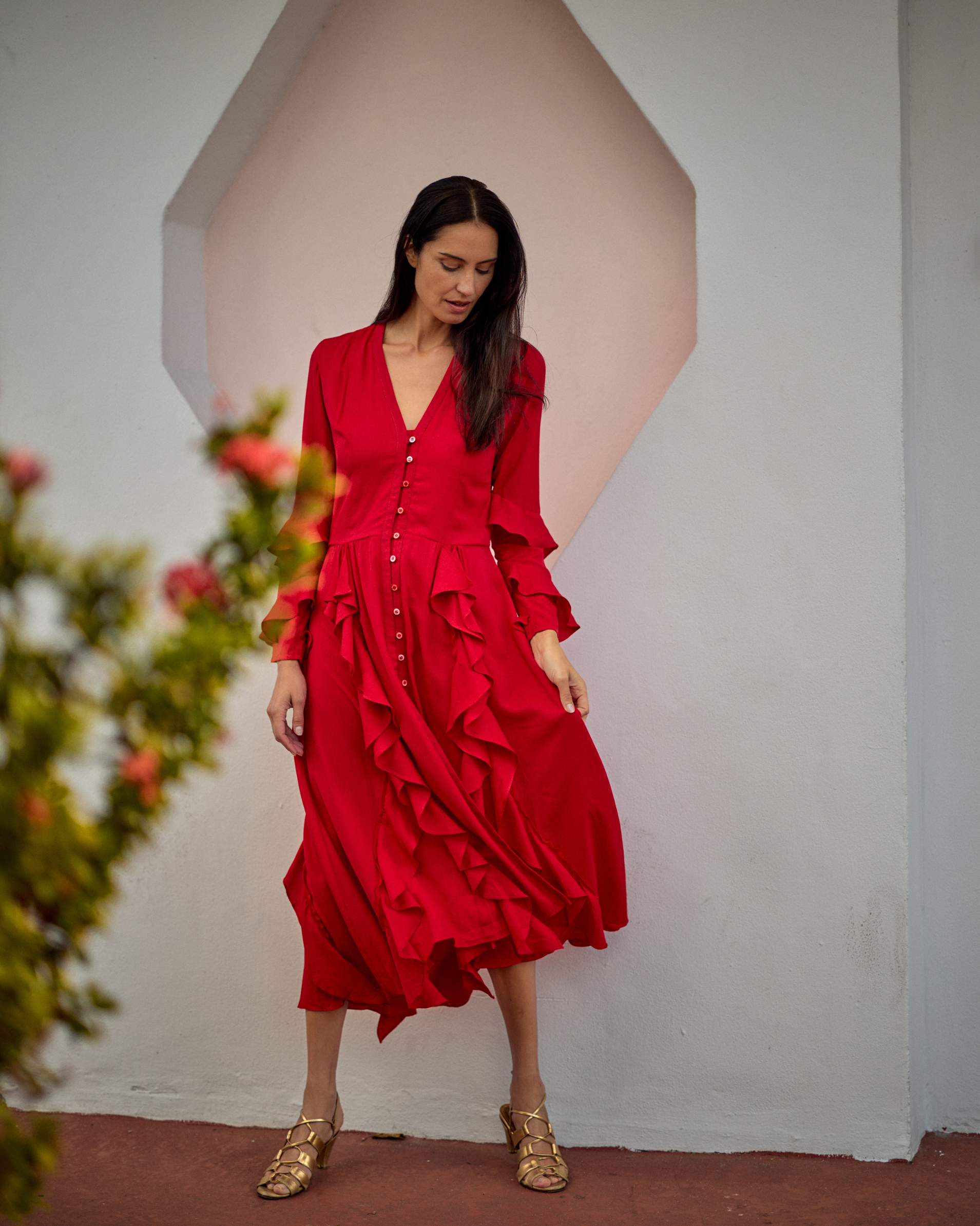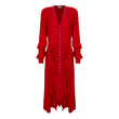 Vestido midi com modelagem ajustada na parte superior e saia evasê. Apresenta decote em V, fechamento frontal com botões encapados e mangas longas com punhos ajustados. Detalhes de babados verticais aplicados na parte frontal e lateral.