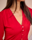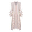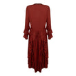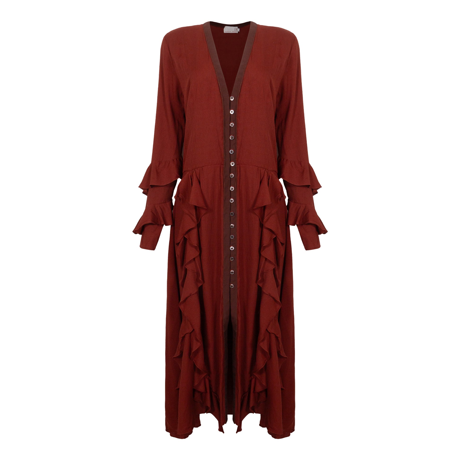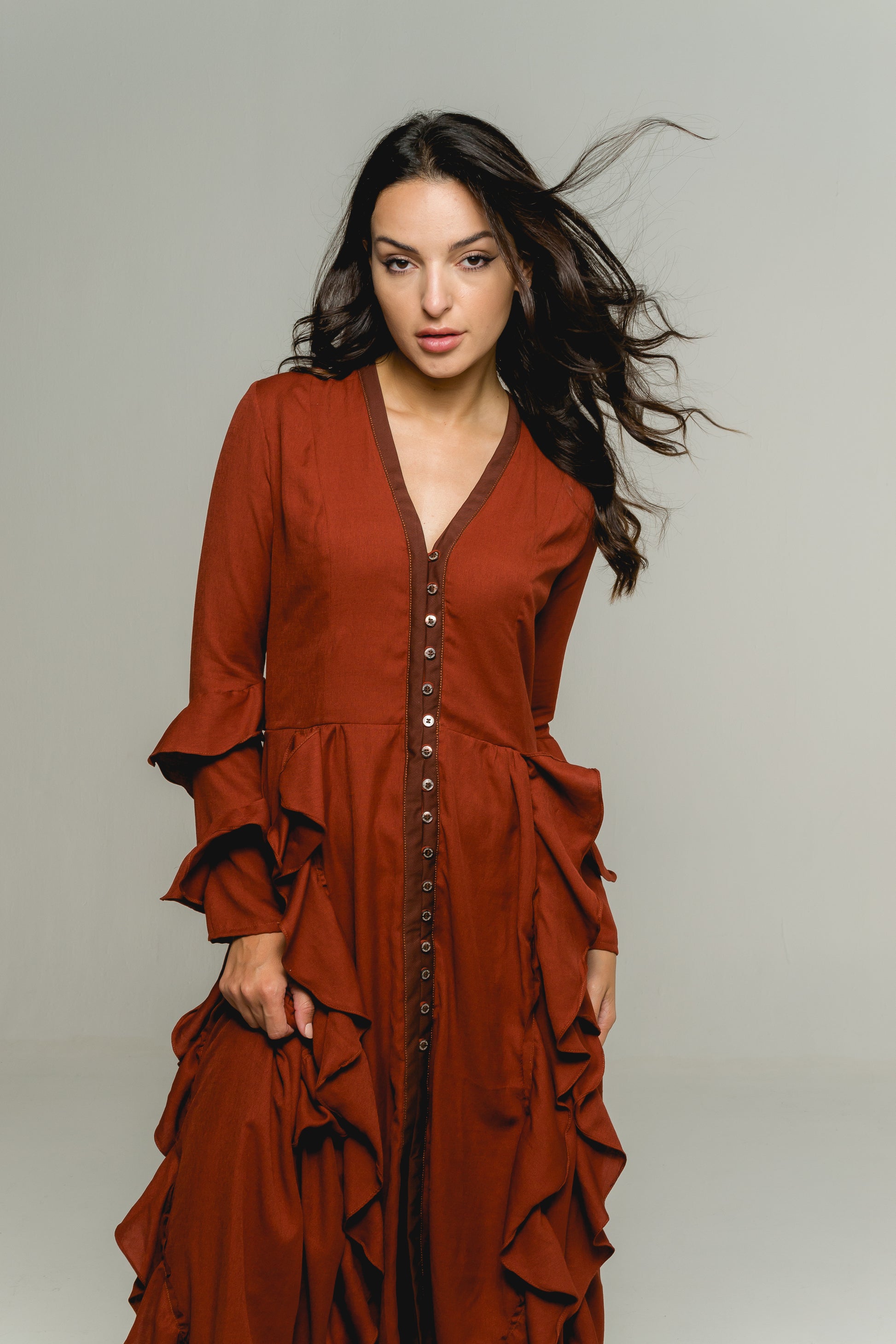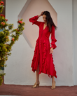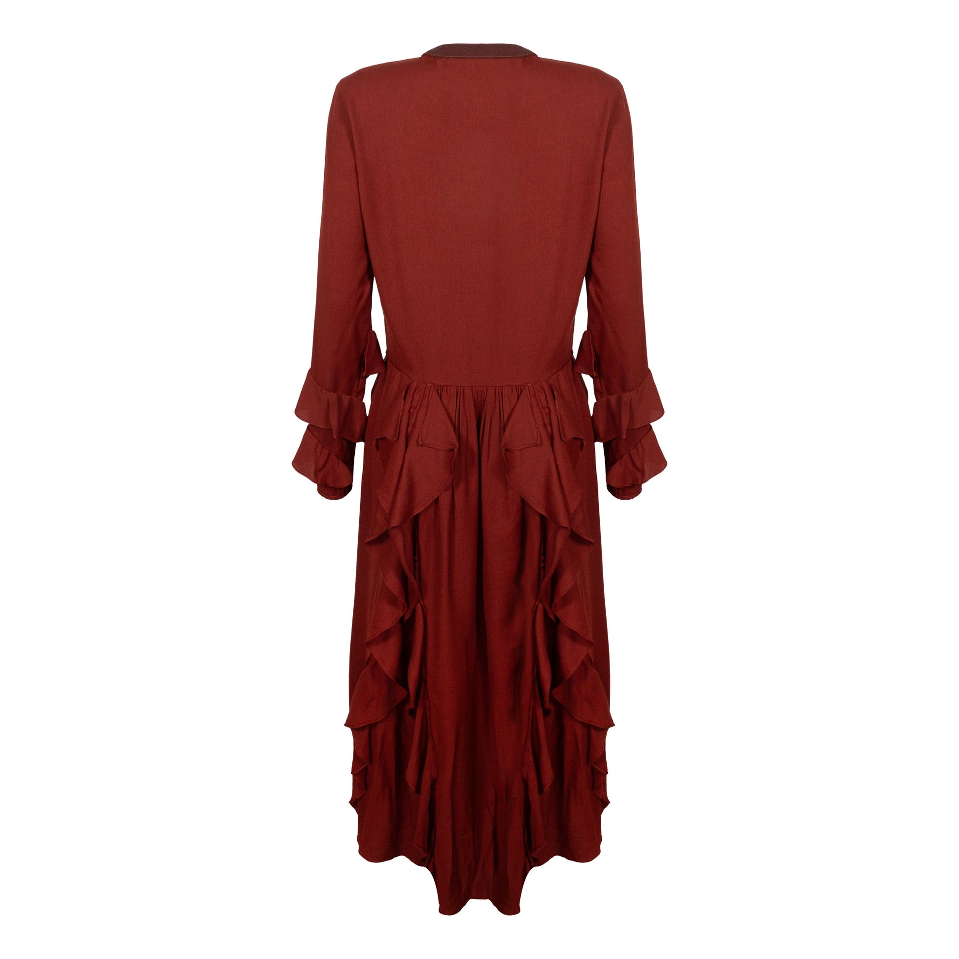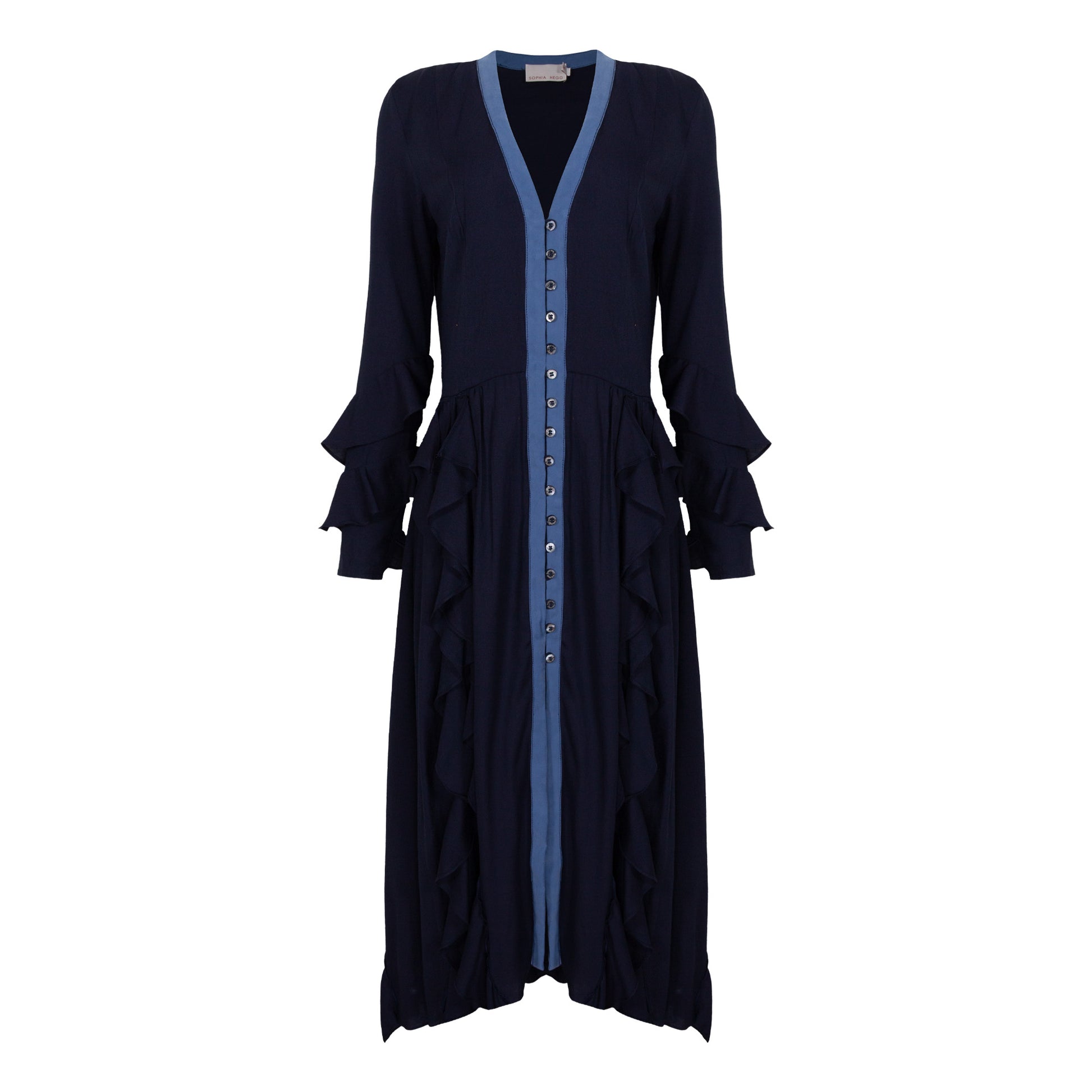 Vestido midi com modelagem ajustada na parte superior e saia evasê. Apresenta decote em V, fechamento frontal com botões encapados e mangas longas com punhos ajustados. Detalhes de babados verticais aplicados na parte frontal e lateral.