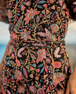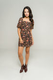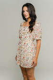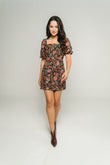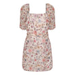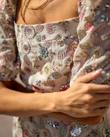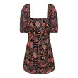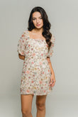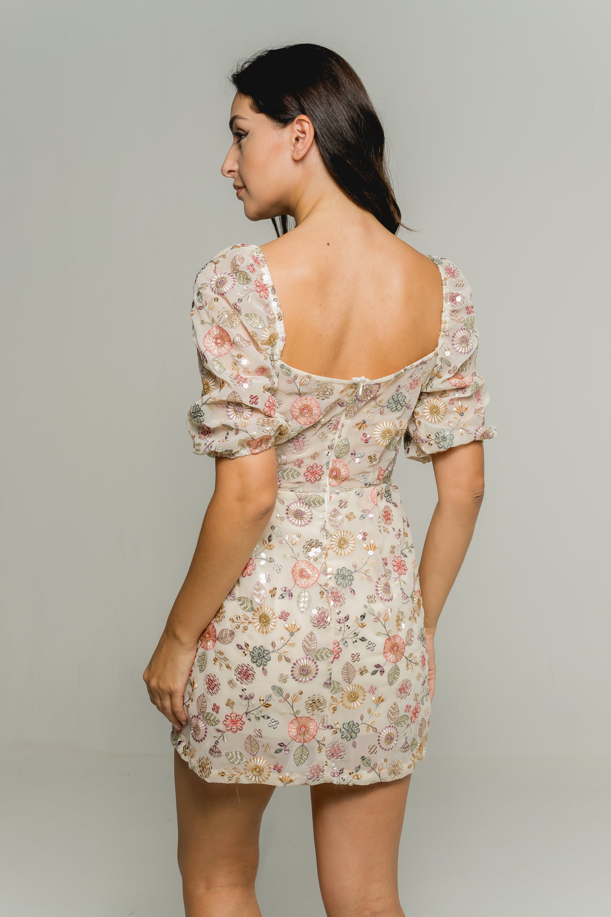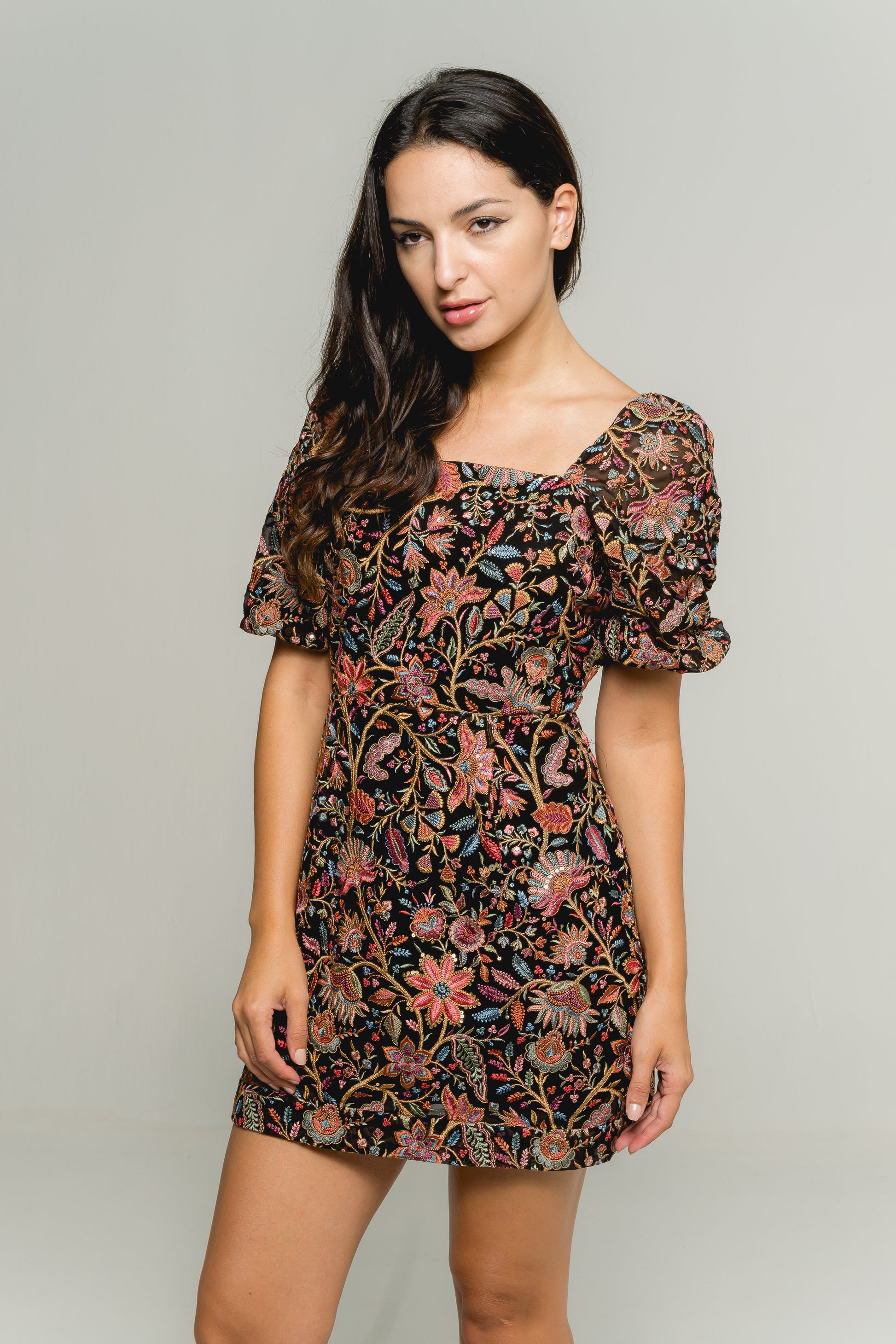 Vestido curto floral bordado. Mangas bufantes e decote reto. Fechamento com zíper.