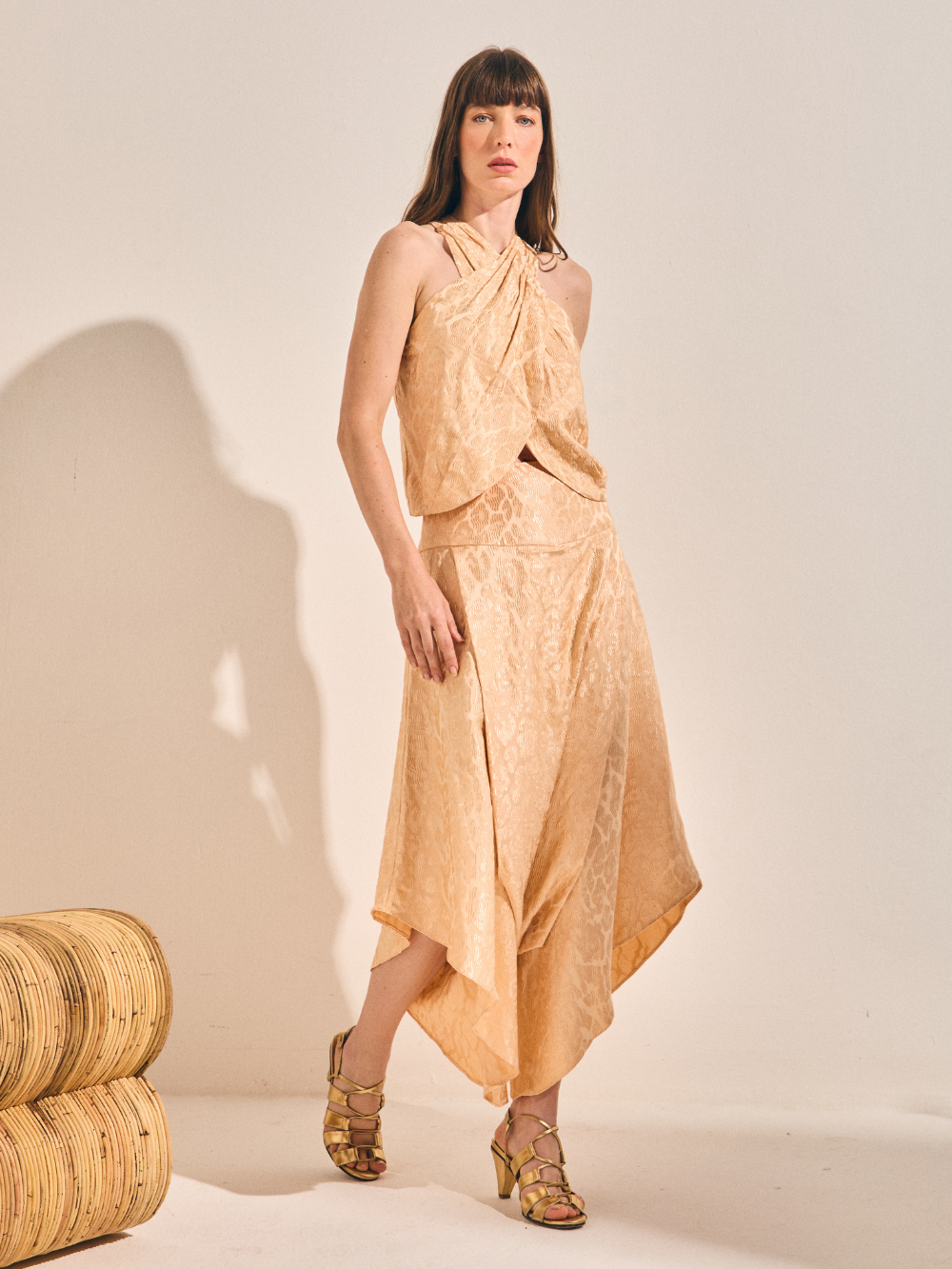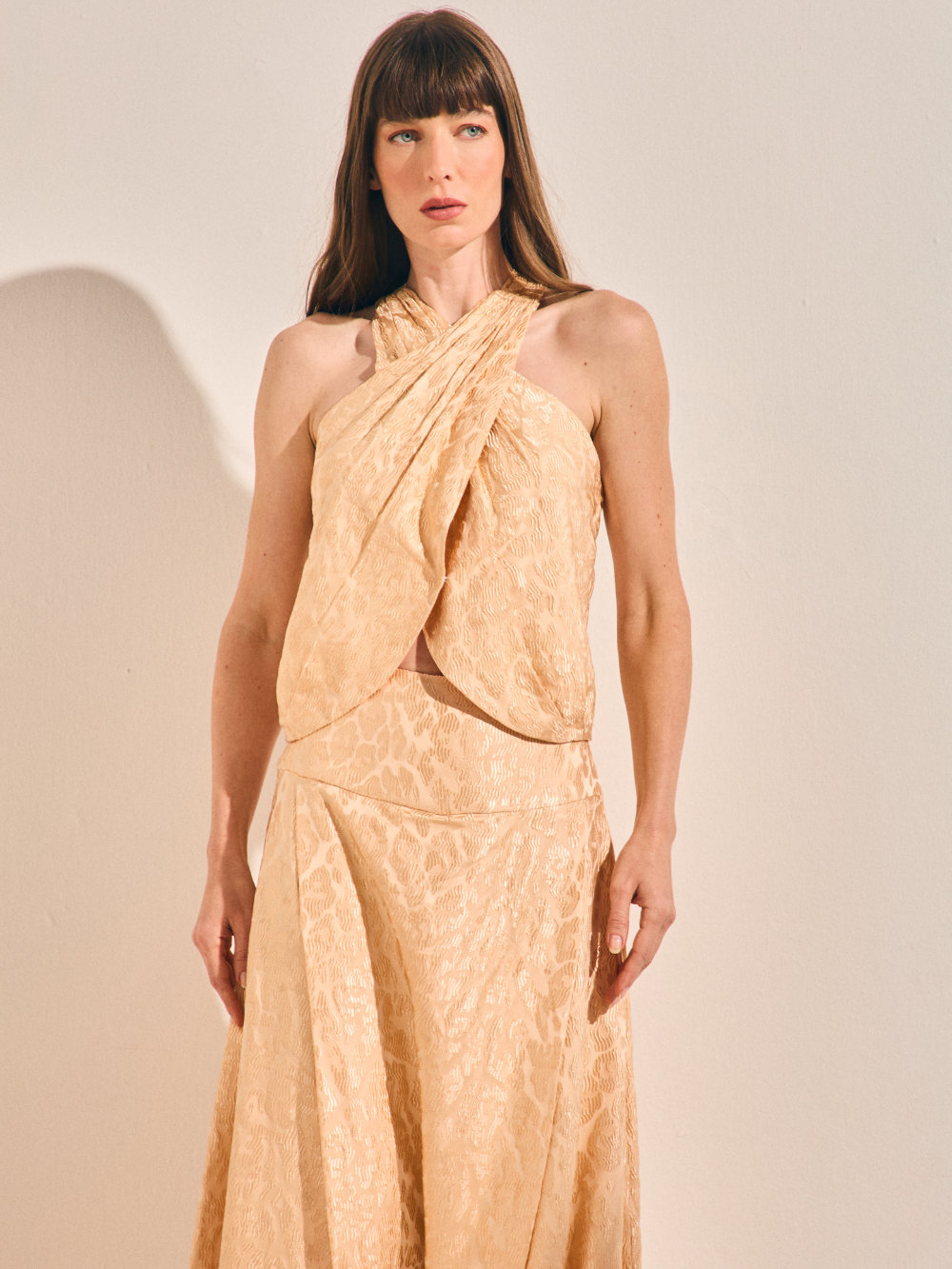 Blusa em tecido brocado com textura e estampa de onça. Com modelagem ajustada, comprimento regular e detalhe transpassado na parte frontal. Possui alças largas e cruzadas.