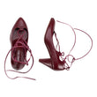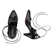 Sapato de couro com salto médio de 7,5 centímetros. Possui bico fino arredondado, tiras transpassadas e fechamento por amarração no tornozelo.