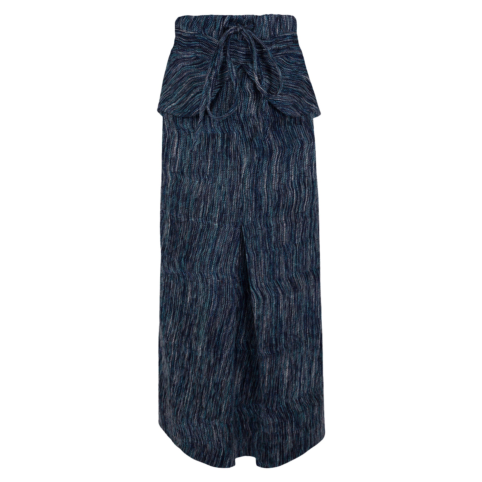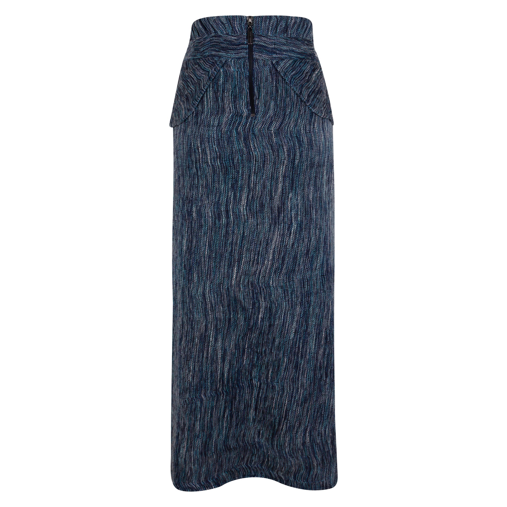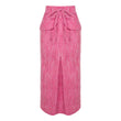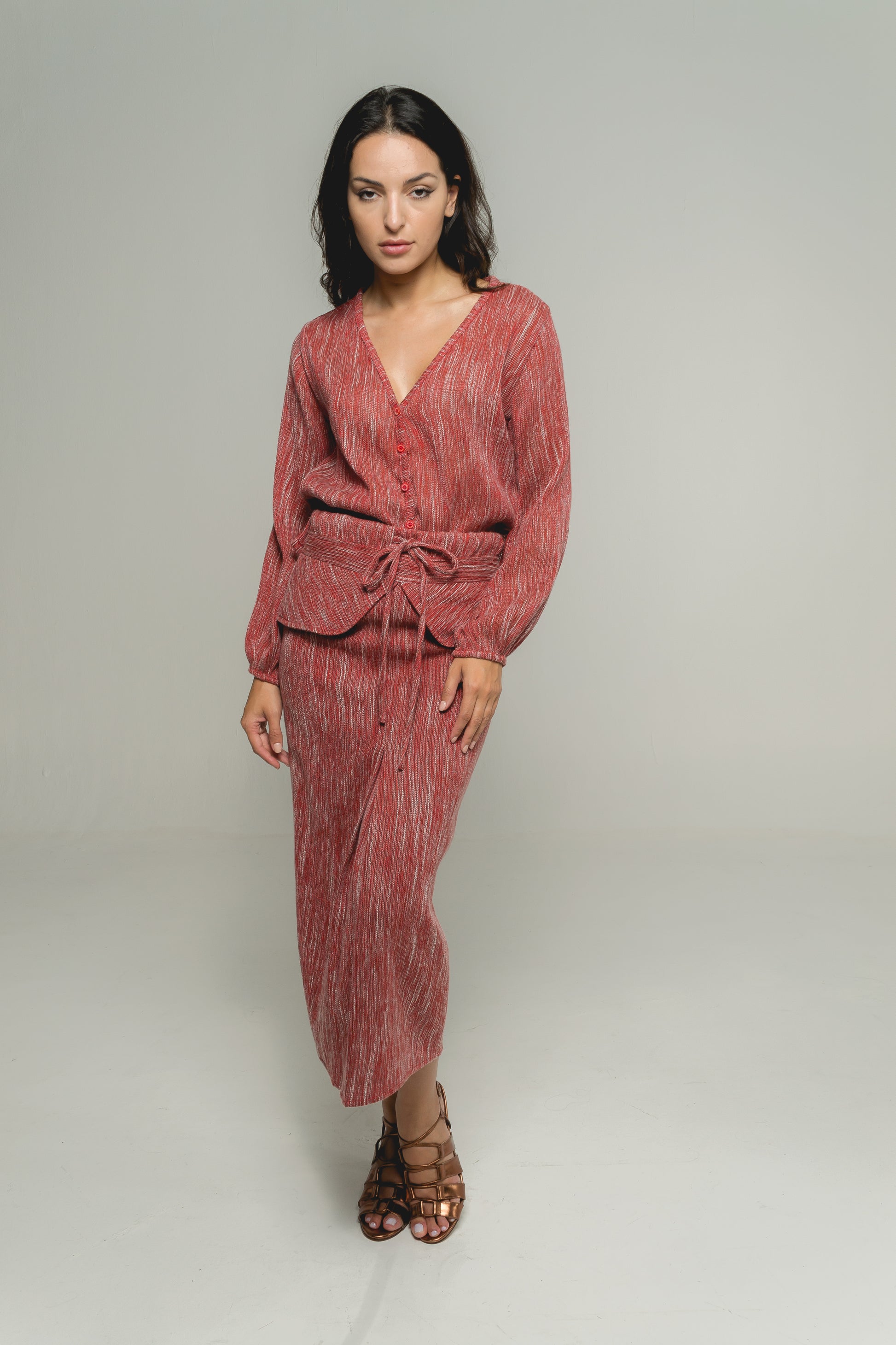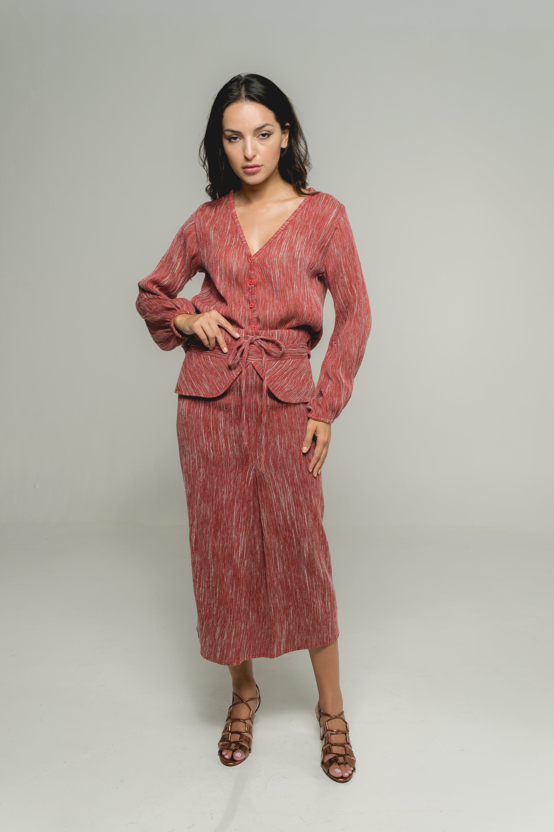 Saia midi reta com pala arredondada. Acompanha cordão e abre prega em "V" embaixo.