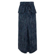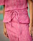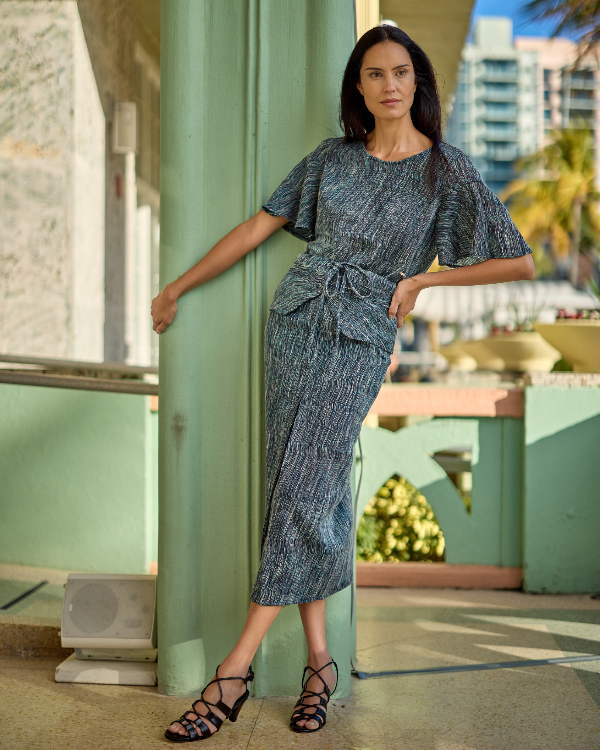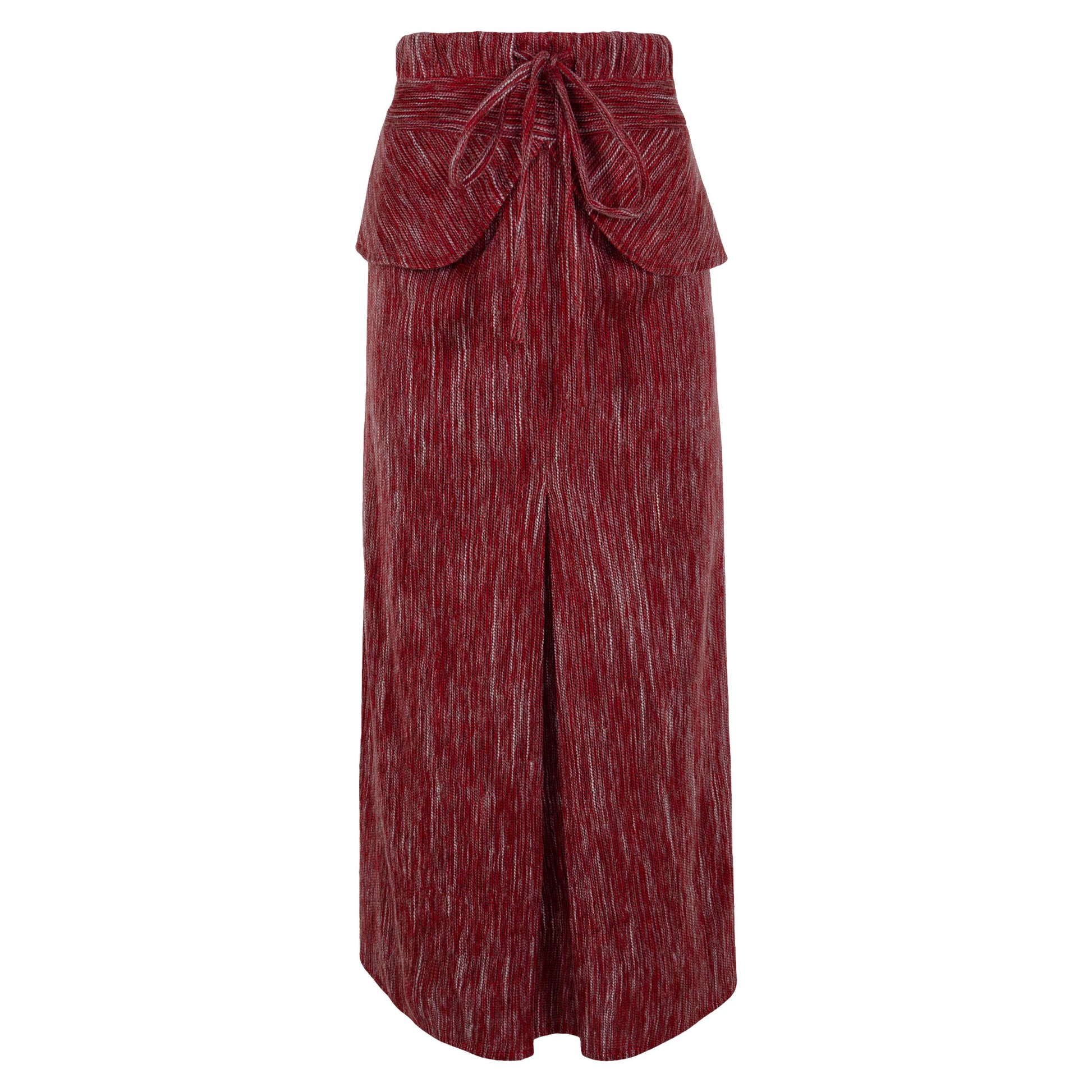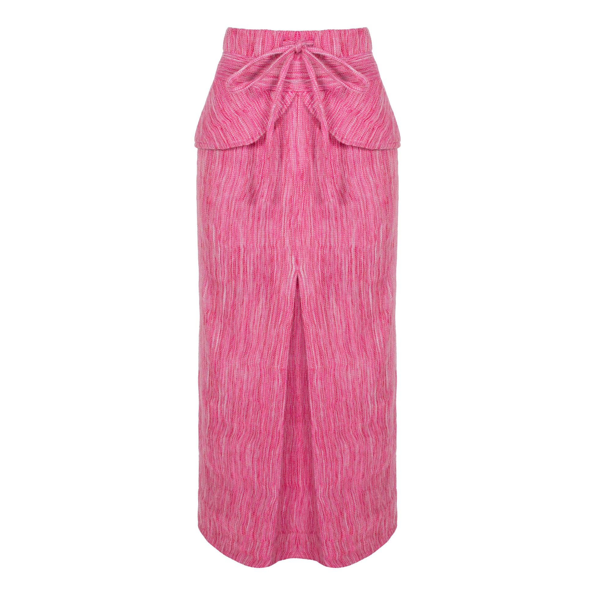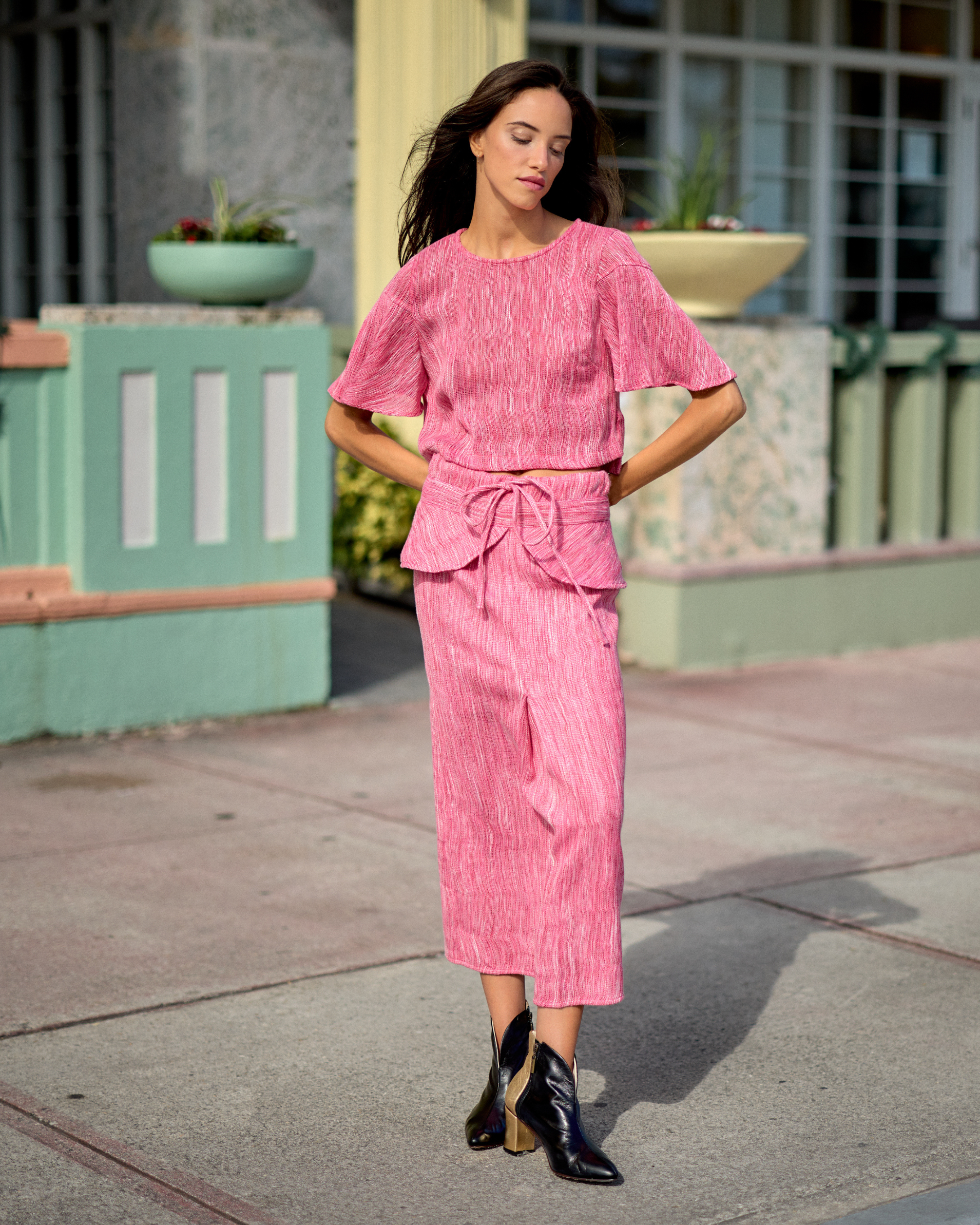 Saia midi reta com pala arredondada. Acompanha cordão e abre prega em "V" embaixo.