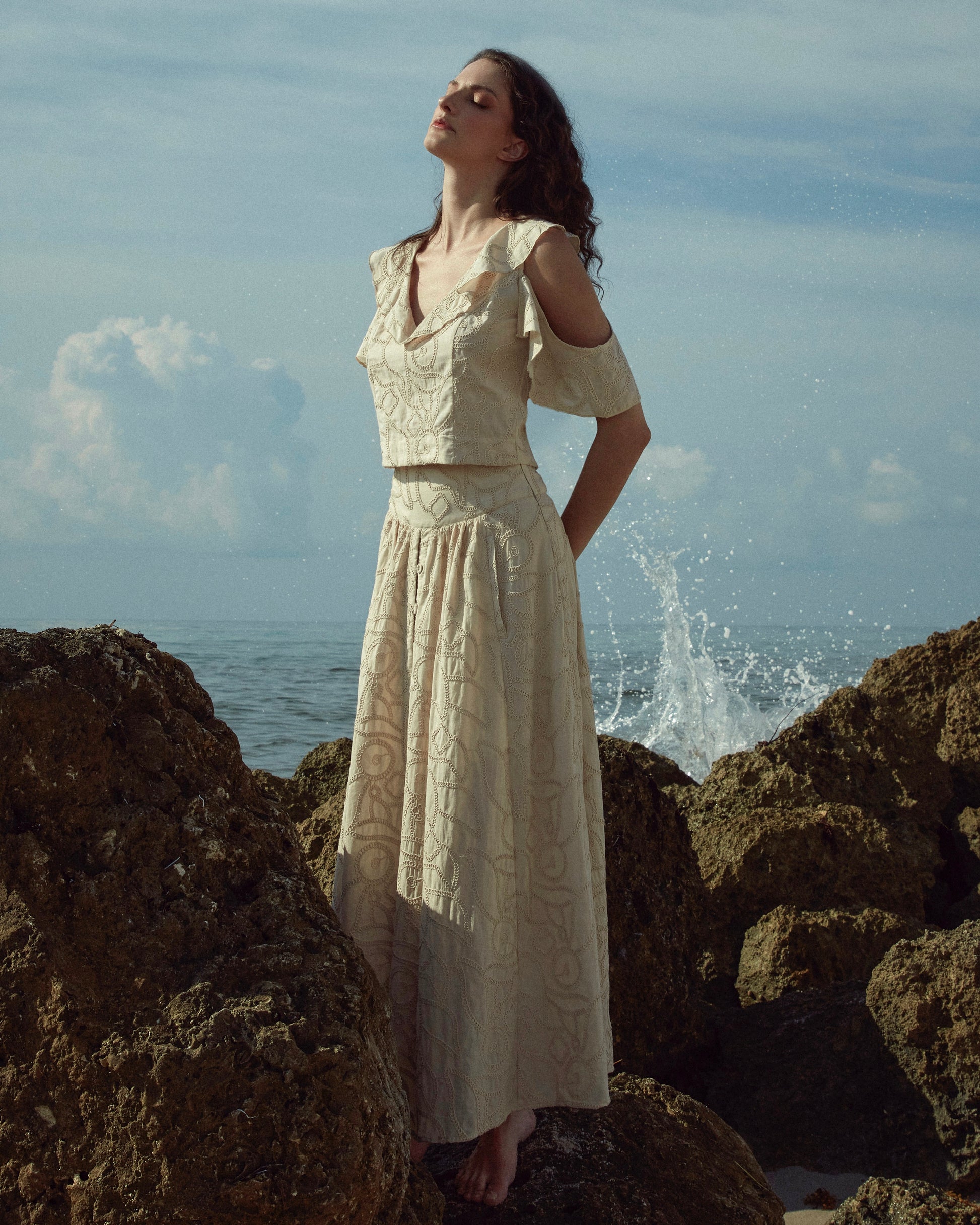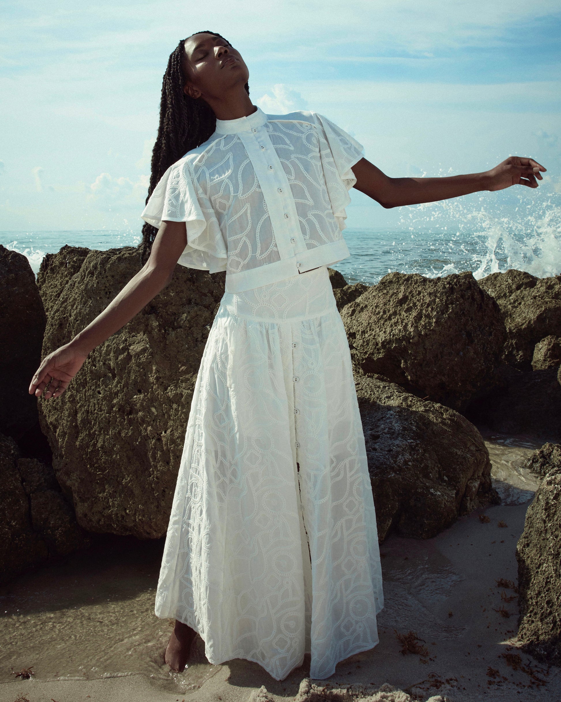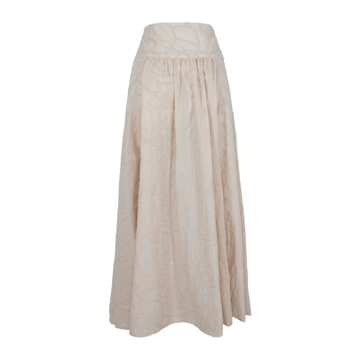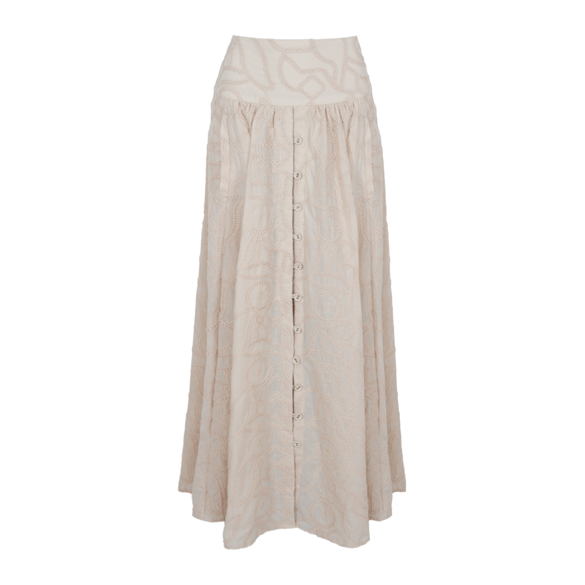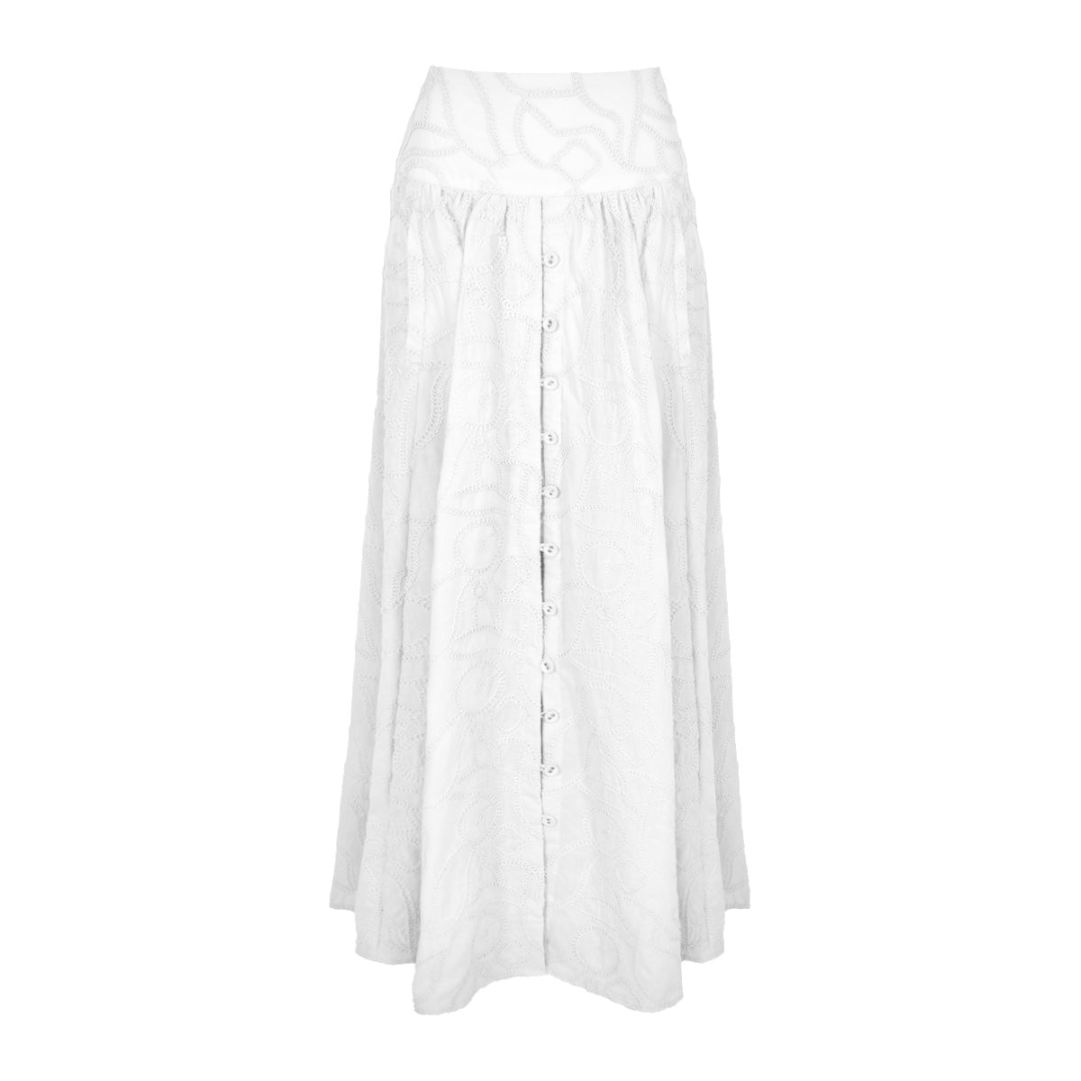 Saia longa em tecido de algodão bordado com abotoamento frontal.