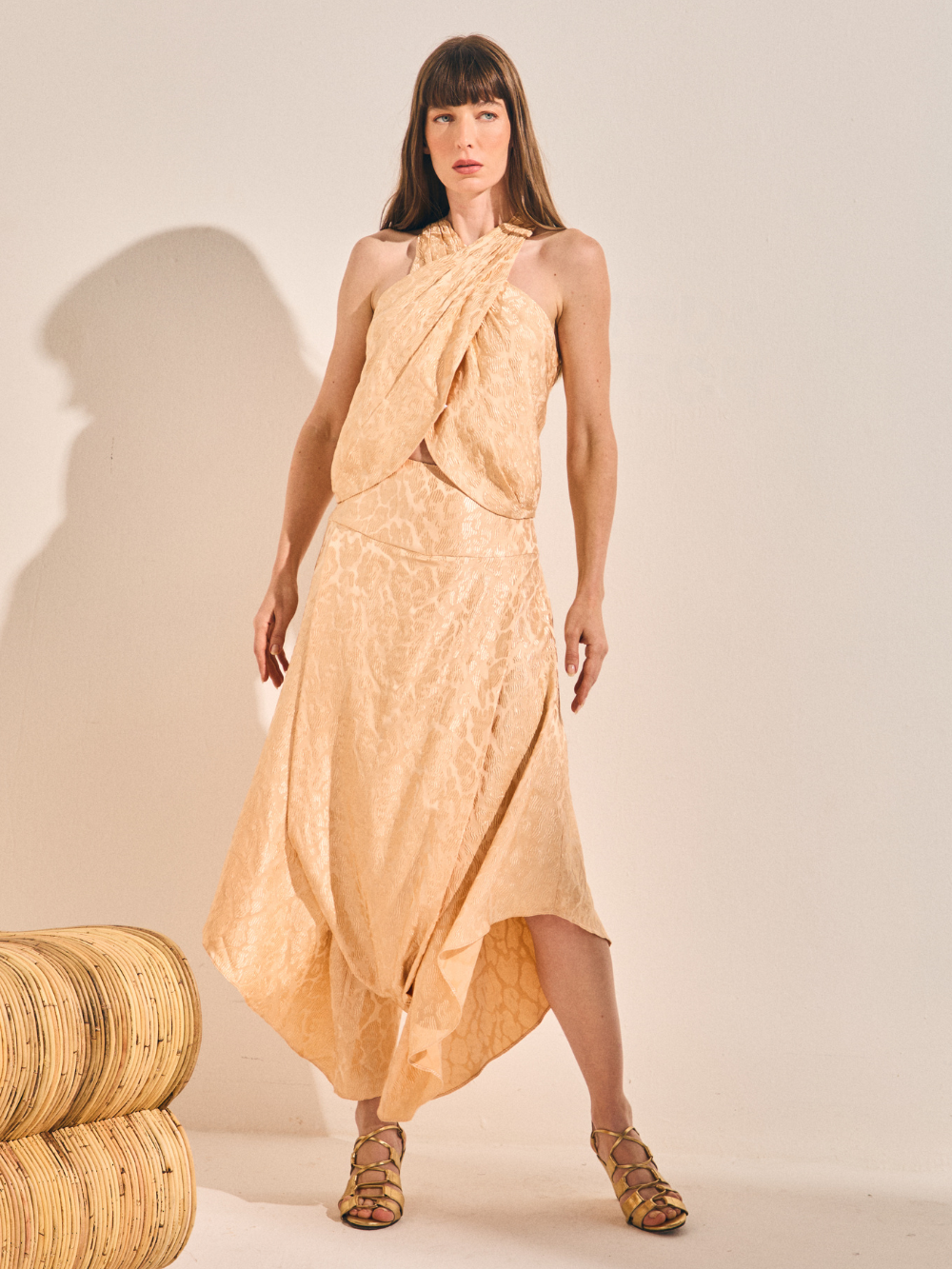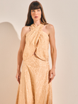 Calça em modelagem saruel, feita de brocado com textura e estampa de onça. Apresenta cintura ajustada e caimento amplo nas pernas