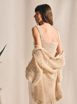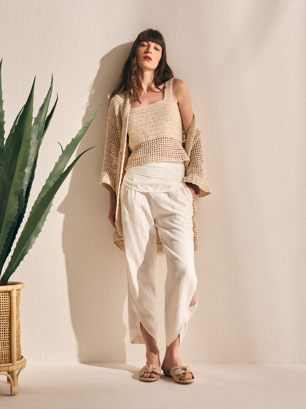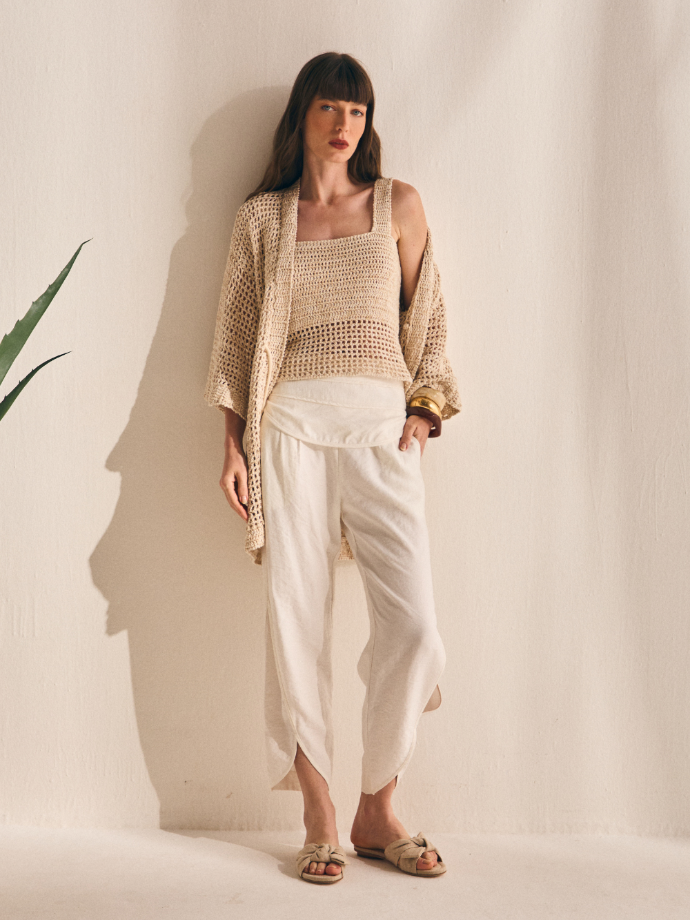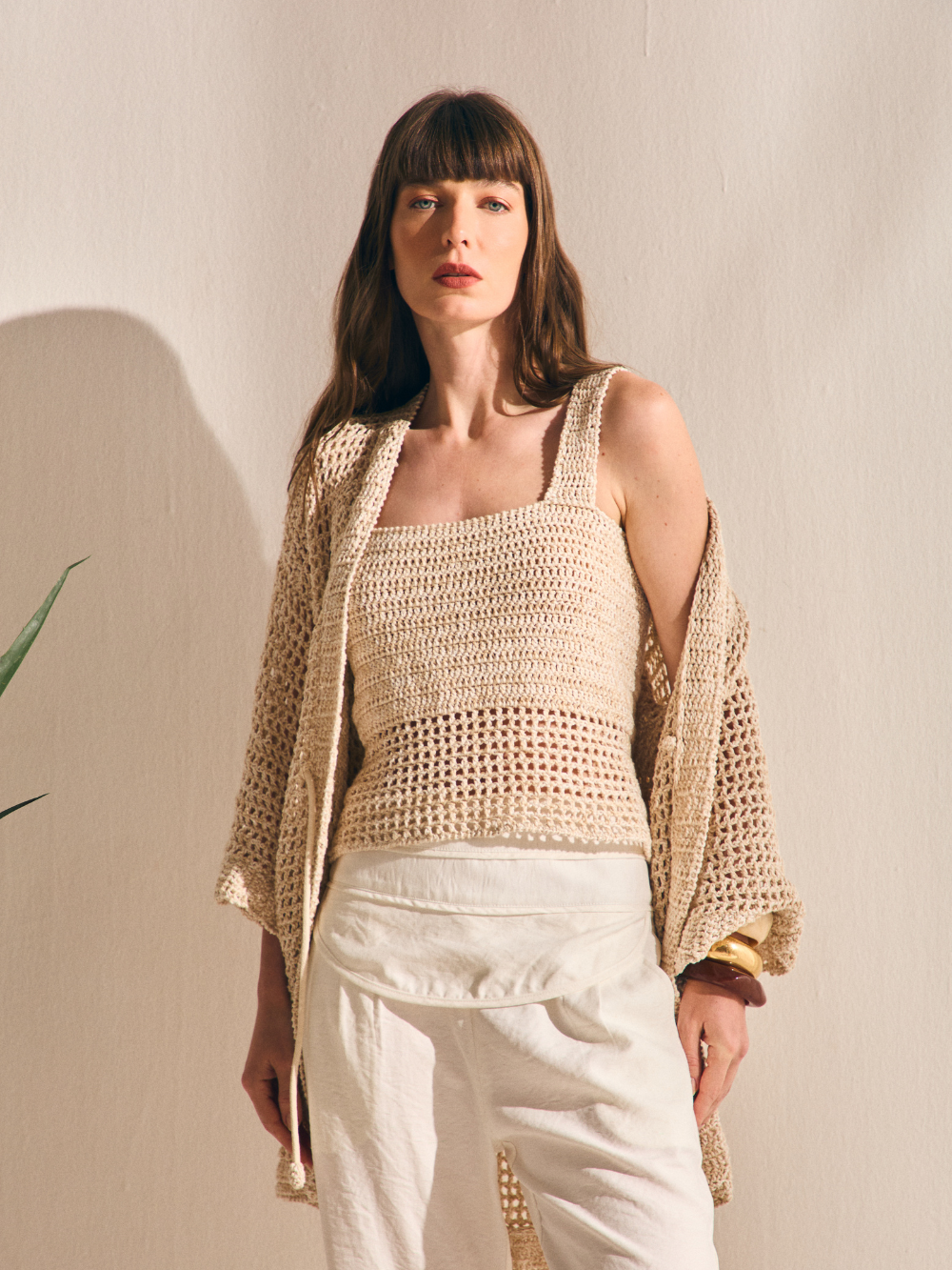 Regata em tricô com alças largas e modelagem reta. A peça apresenta padronagem vazada em dois estilos, mais fechada na parte superior e mais aberta na barra