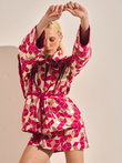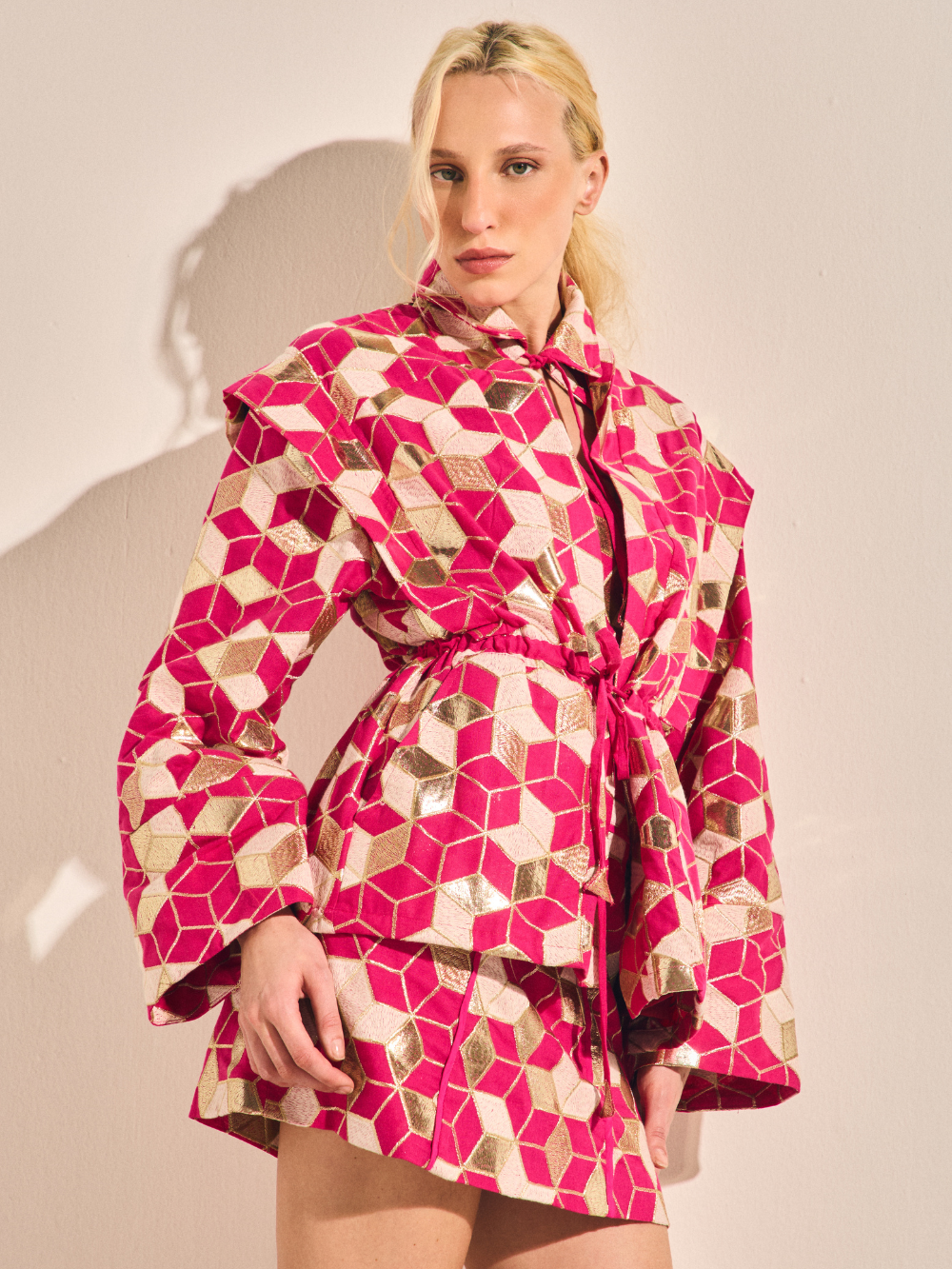 Kimono de modelagem estruturada com estampa geométrica em tons de pink, dourado, branco e bronze, criando um efeito tridimensional moderno e impactante. Possui amarração na gola e na cintura.