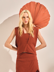 Regata feita em tecido de alfaiataria leve. Possui decote bem aberto e acompanha top faixa. Shape levemente afunilado na barra.