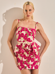 Vestido curto com alças finas, estampa geométrica tridimensional nas cores pink, dourado e off-white. Recortes laterais estratégicos na cintura e modelagem justa no corpo. Possui cinto de amarração com babado.