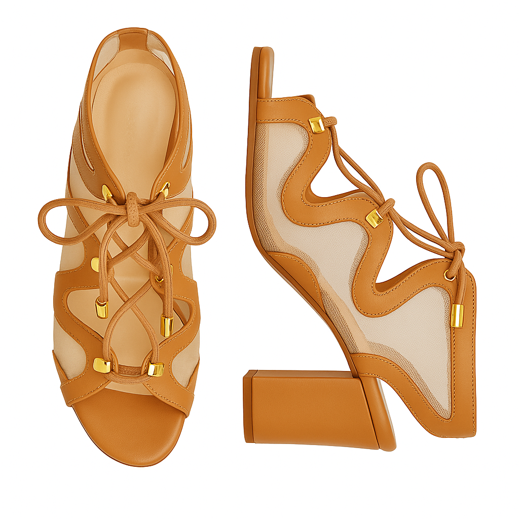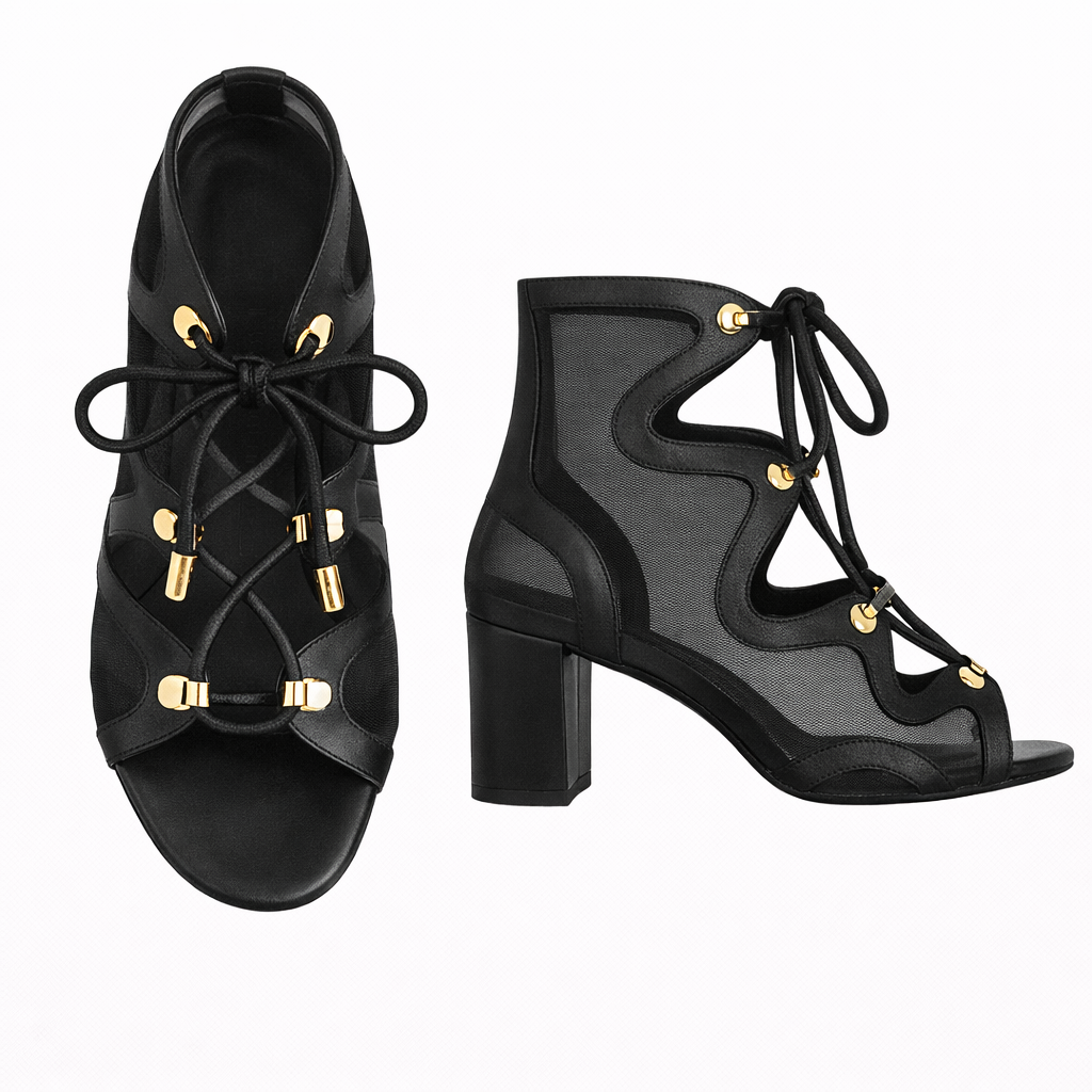 Sandália gladiadora moderna em mesh translúcido com recortes em couro, amarração frontal e acabamento em metais dourados.