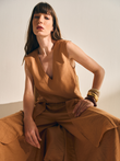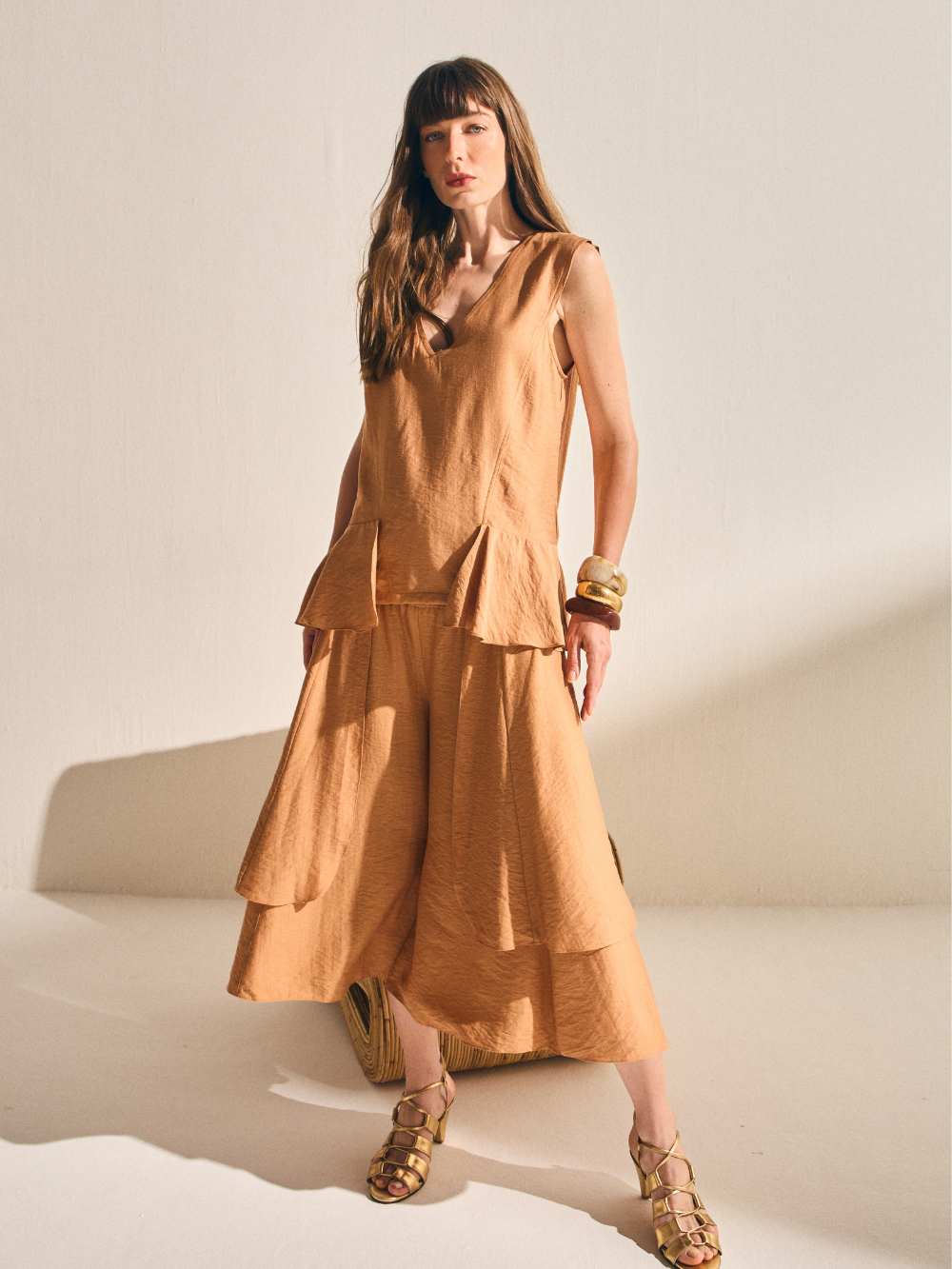 Calça estilo pantacourt com modelagem ampla e comprimento midi, marcada por sobreposição frontal em camadas. Cós de elástico.