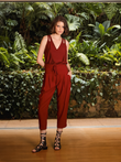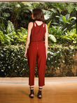 Calça de cintura alta, com cós largo e fechamento por amarração frontal. A modelagem é reta, com pernas levemente amplas e comprimento cropped. Apresenta pregas frontais que estruturam o caimento e bolsos laterais