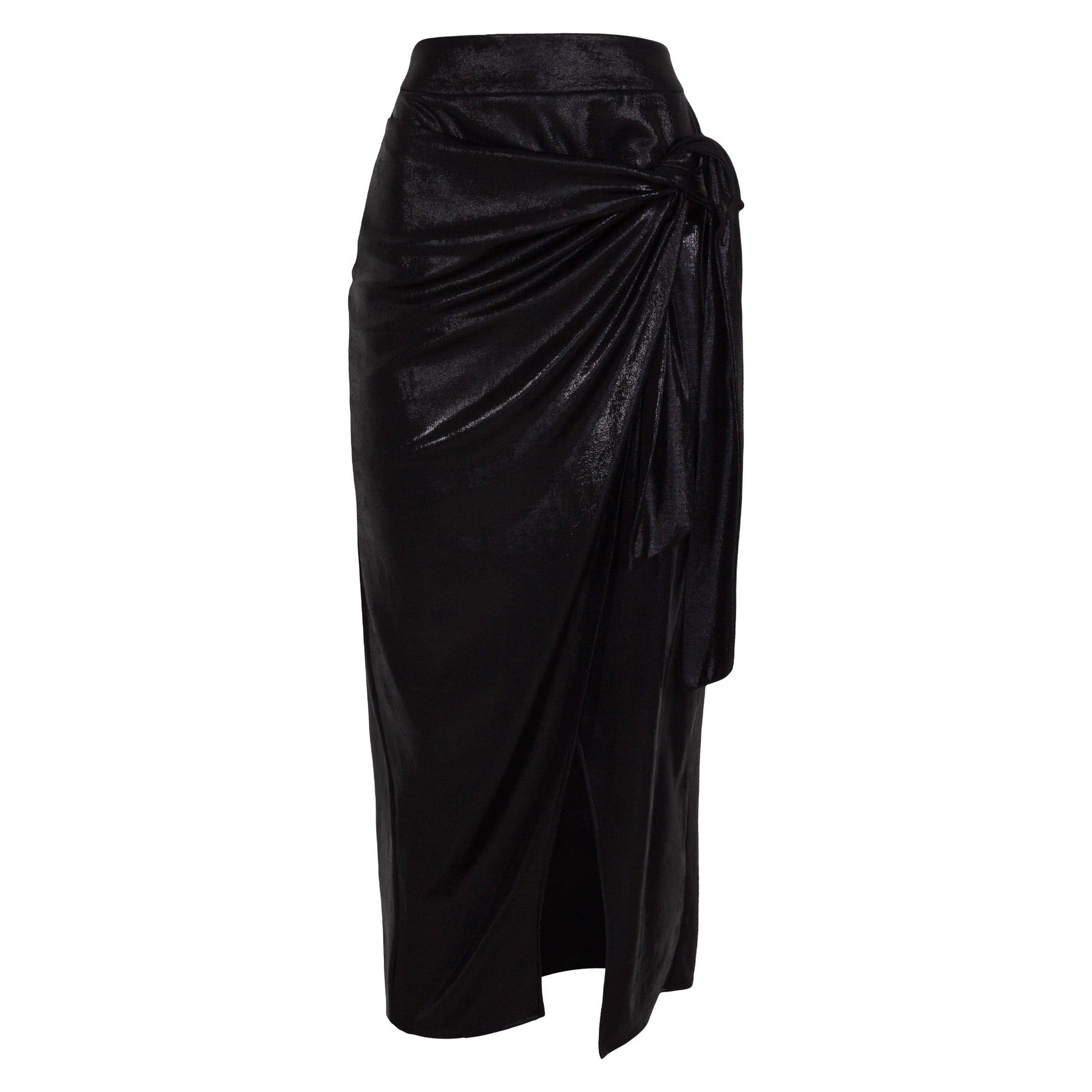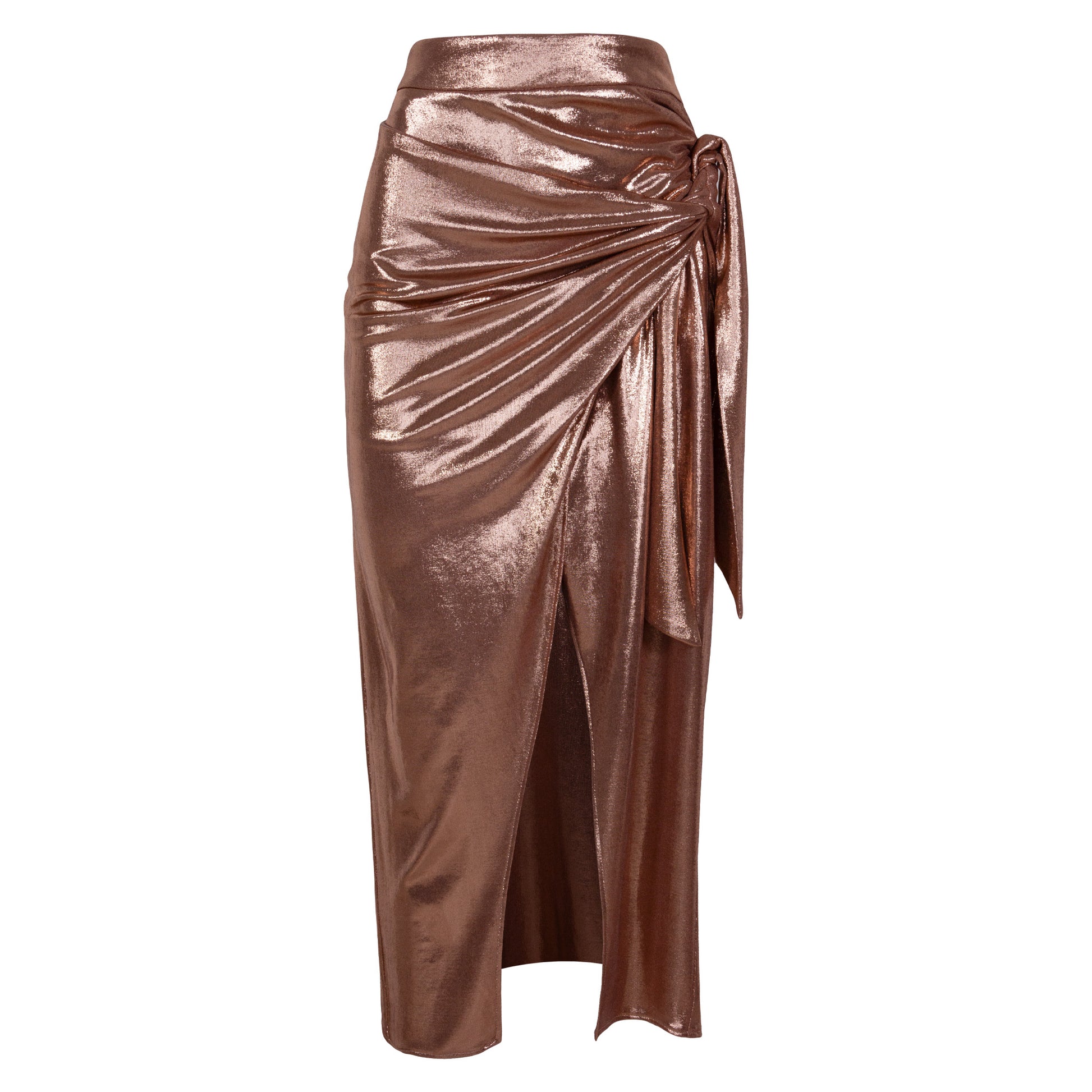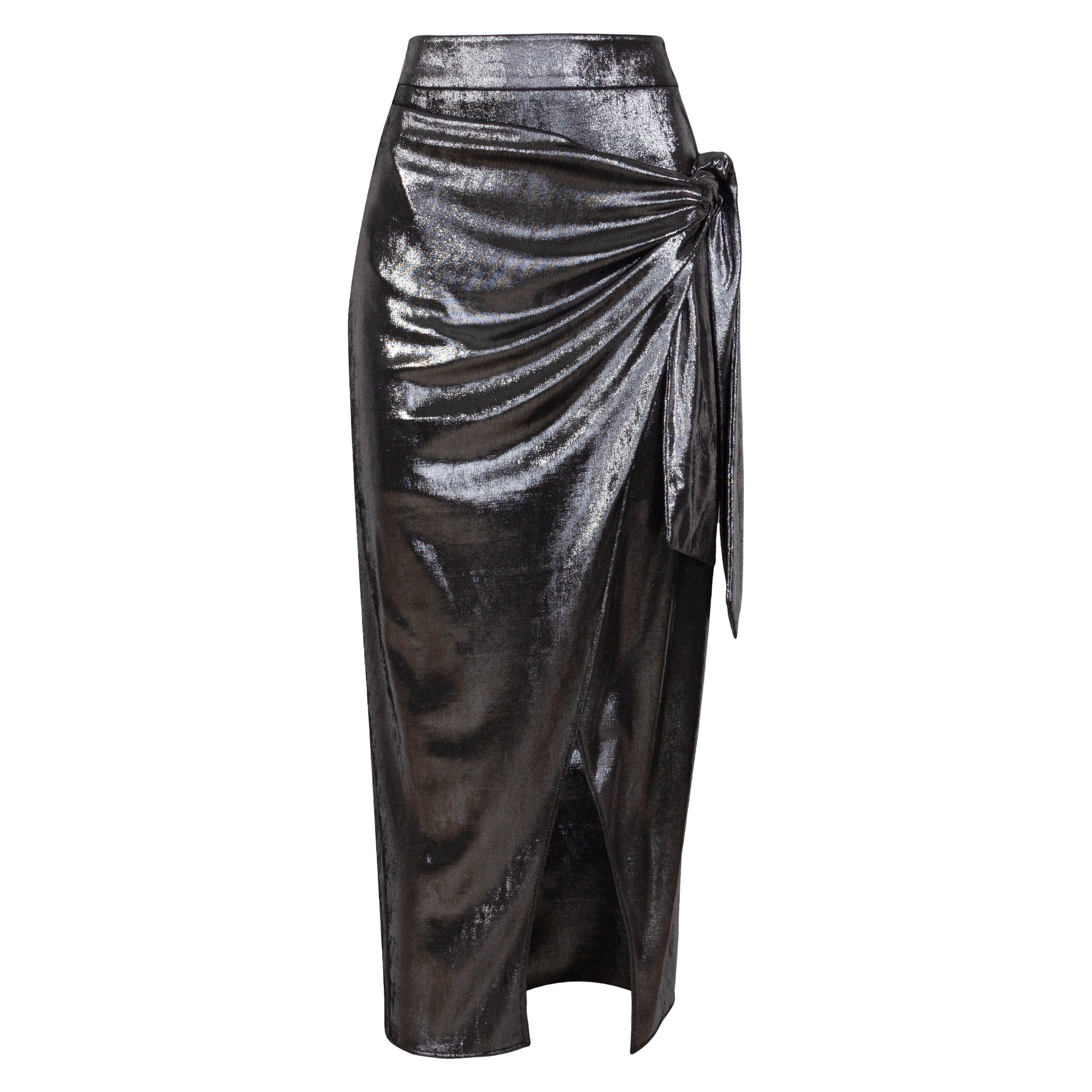 Saia midi com corte transpassado em tecido metalizado, proporcionando um caimento ajustado. Detalhe de amarração na lateral.