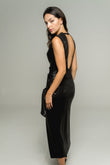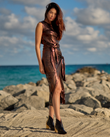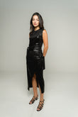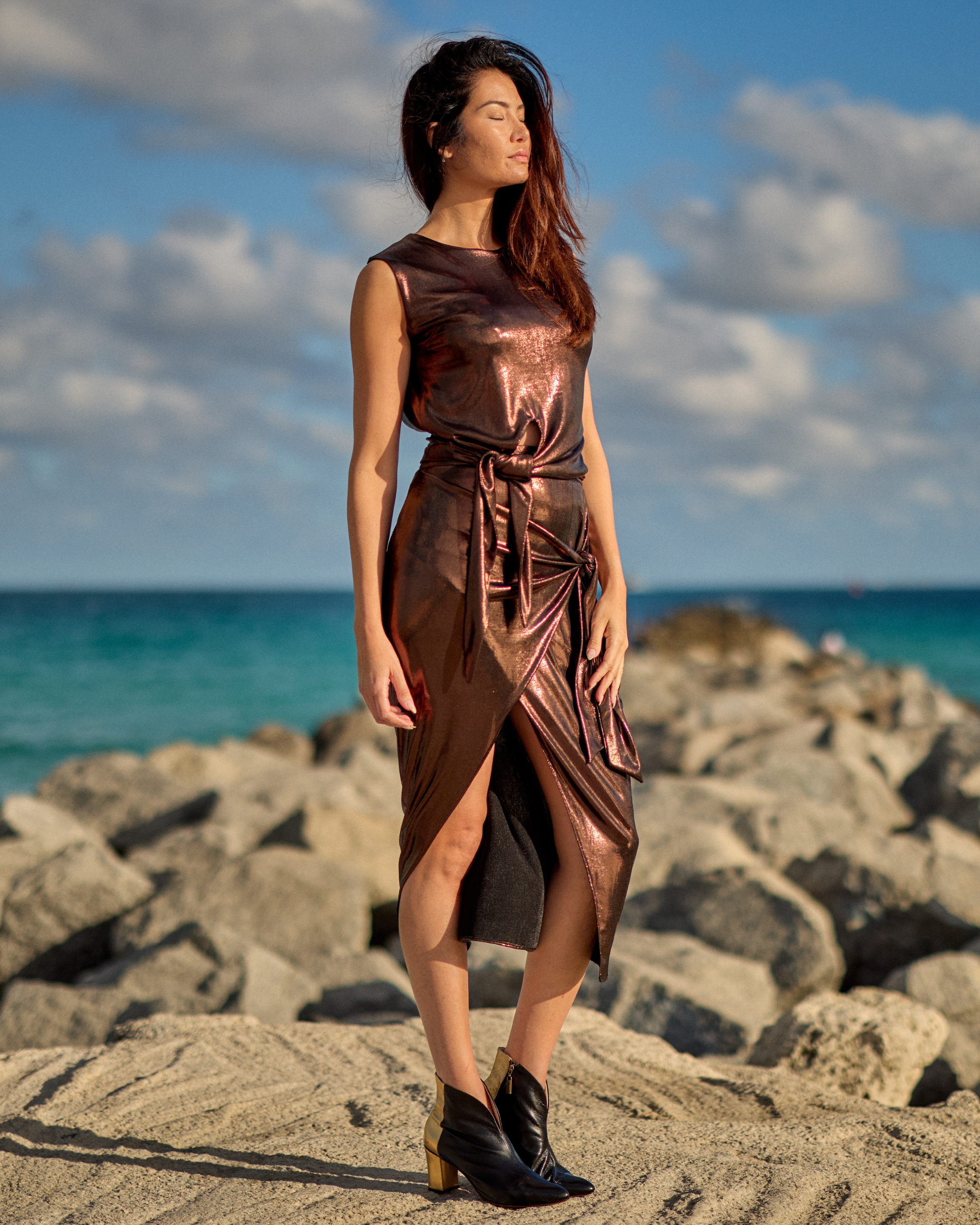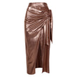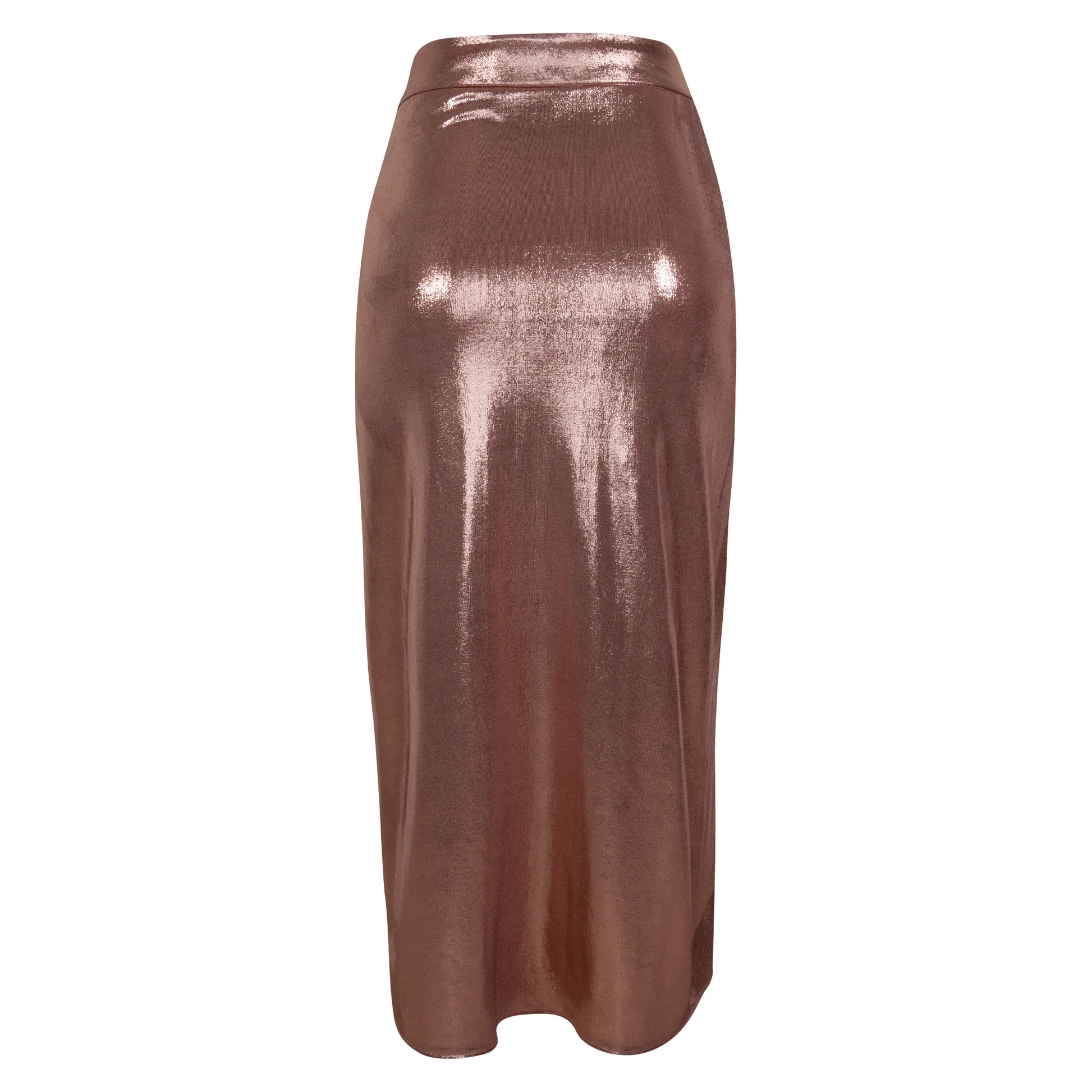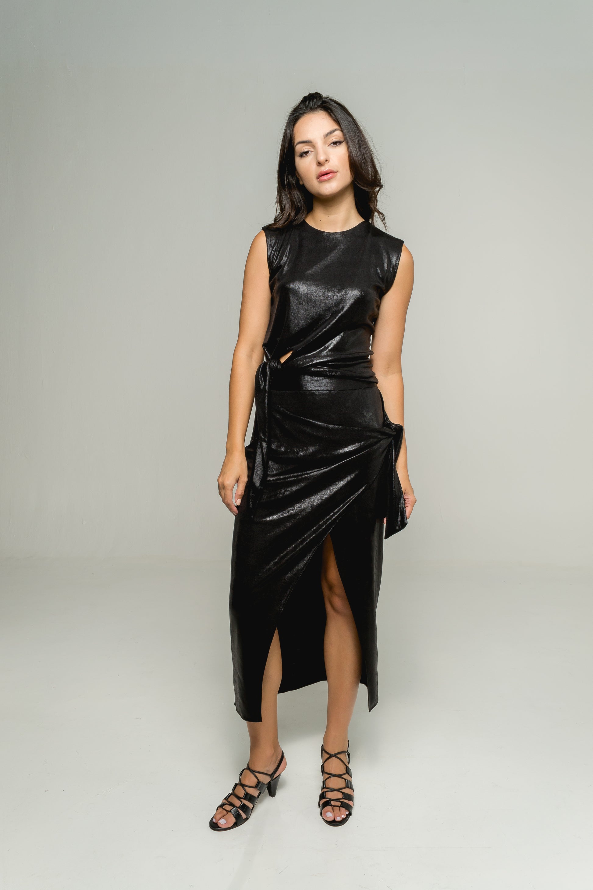 Saia midi com corte transpassado em tecido metalizado, proporcionando um caimento ajustado. Detalhe de amarração na lateral.