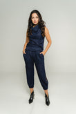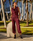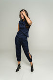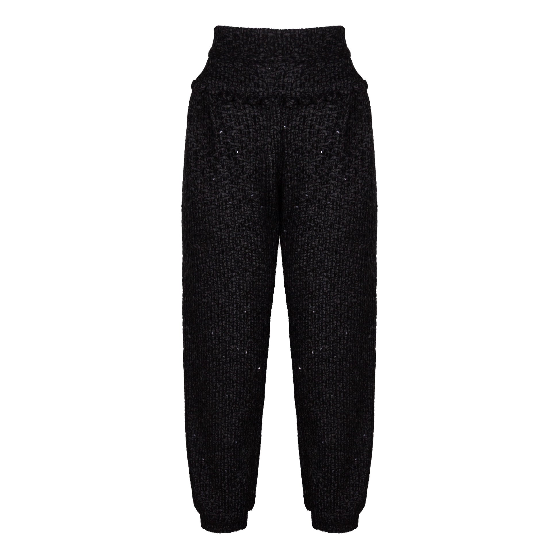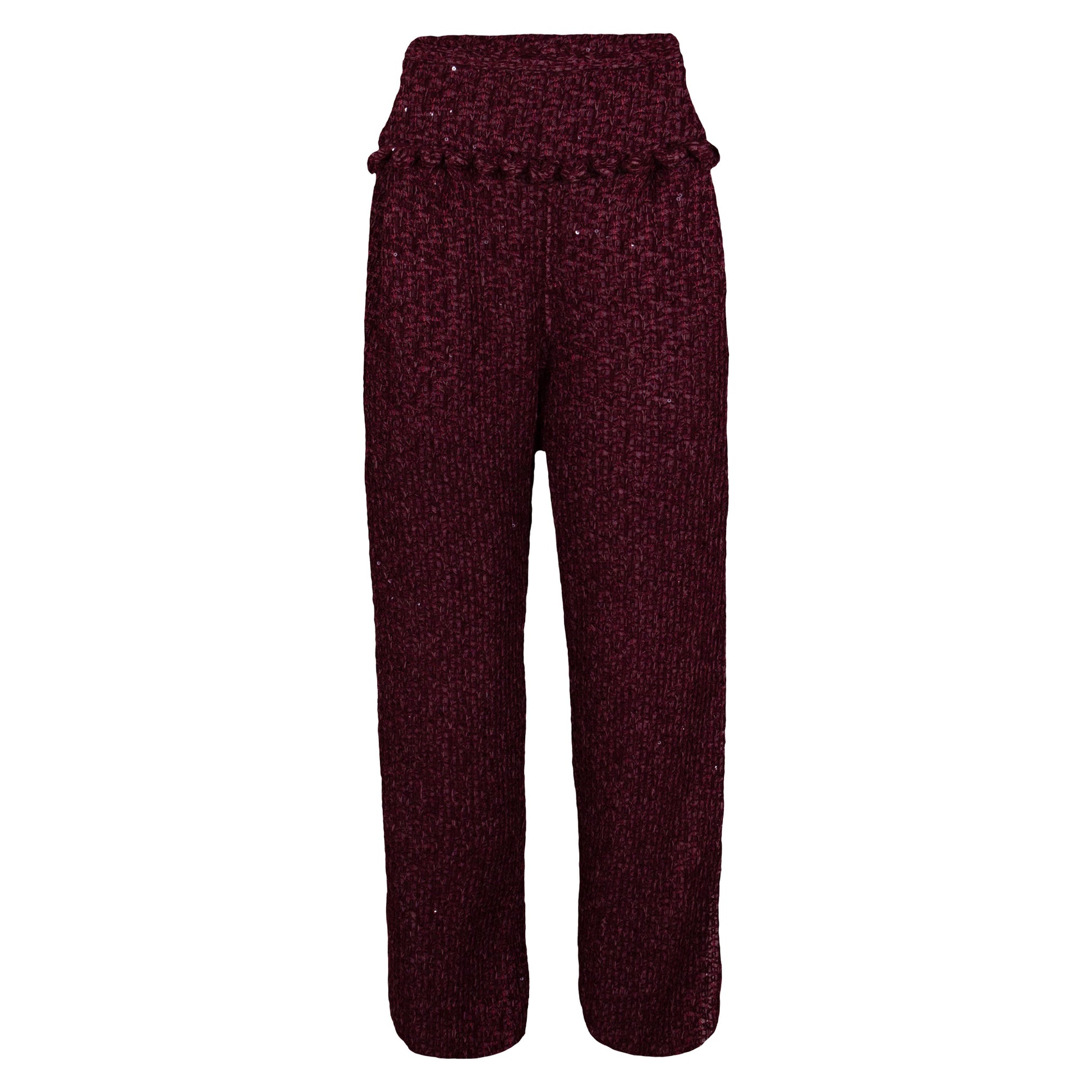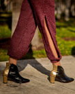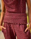 Calça com modelagem reta e cintura alta, feita em tecido texturizado. A peça possui fendas laterais, além de detalhes texturizados nas barras, conferindo uma finalização elegante.