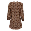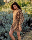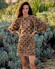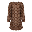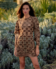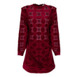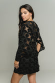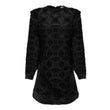 Vestido curto em tecido bordado com detalhes florais. Possui mangas longas volumosas e punhos ajustados.