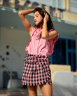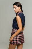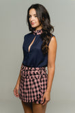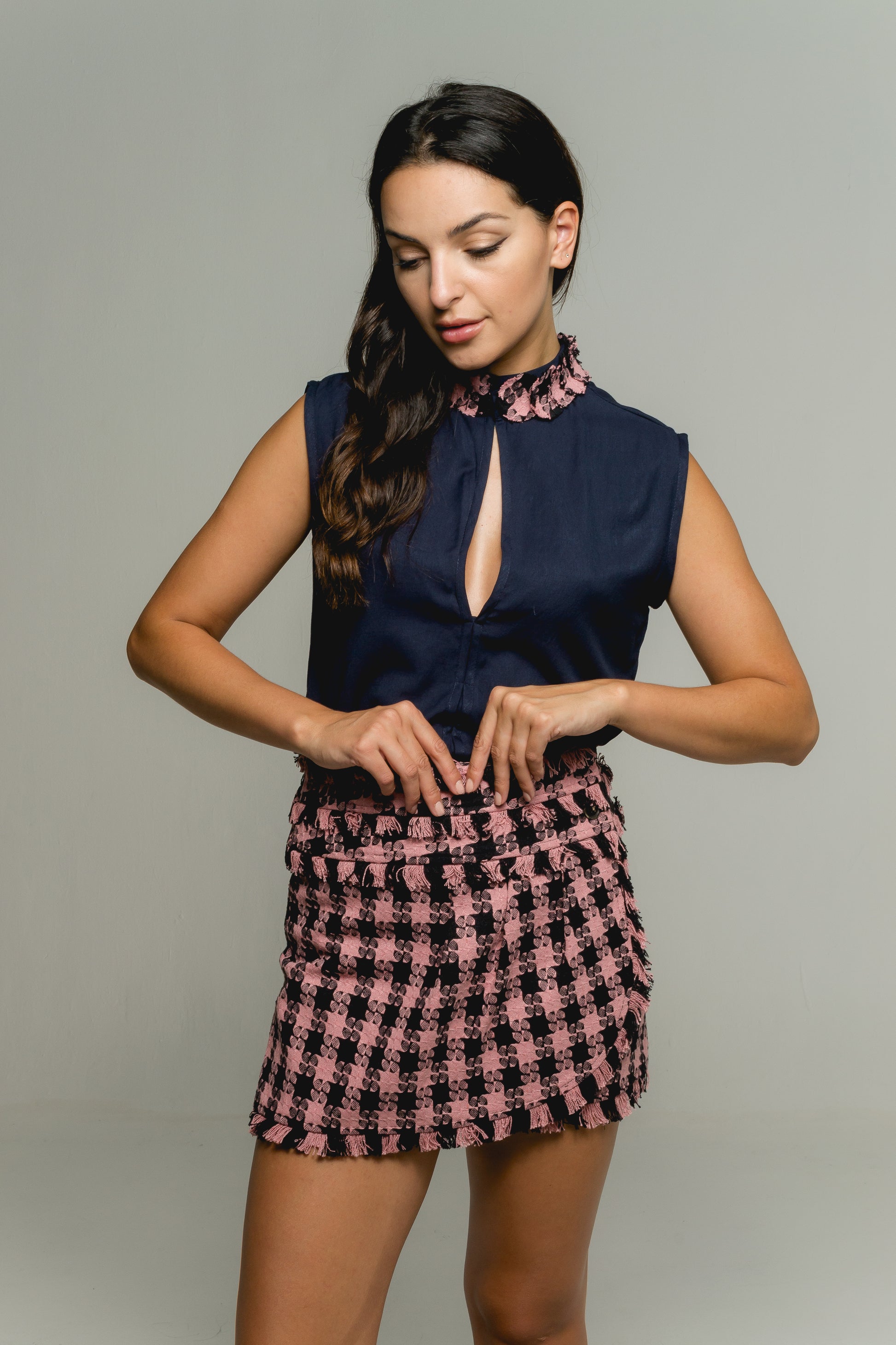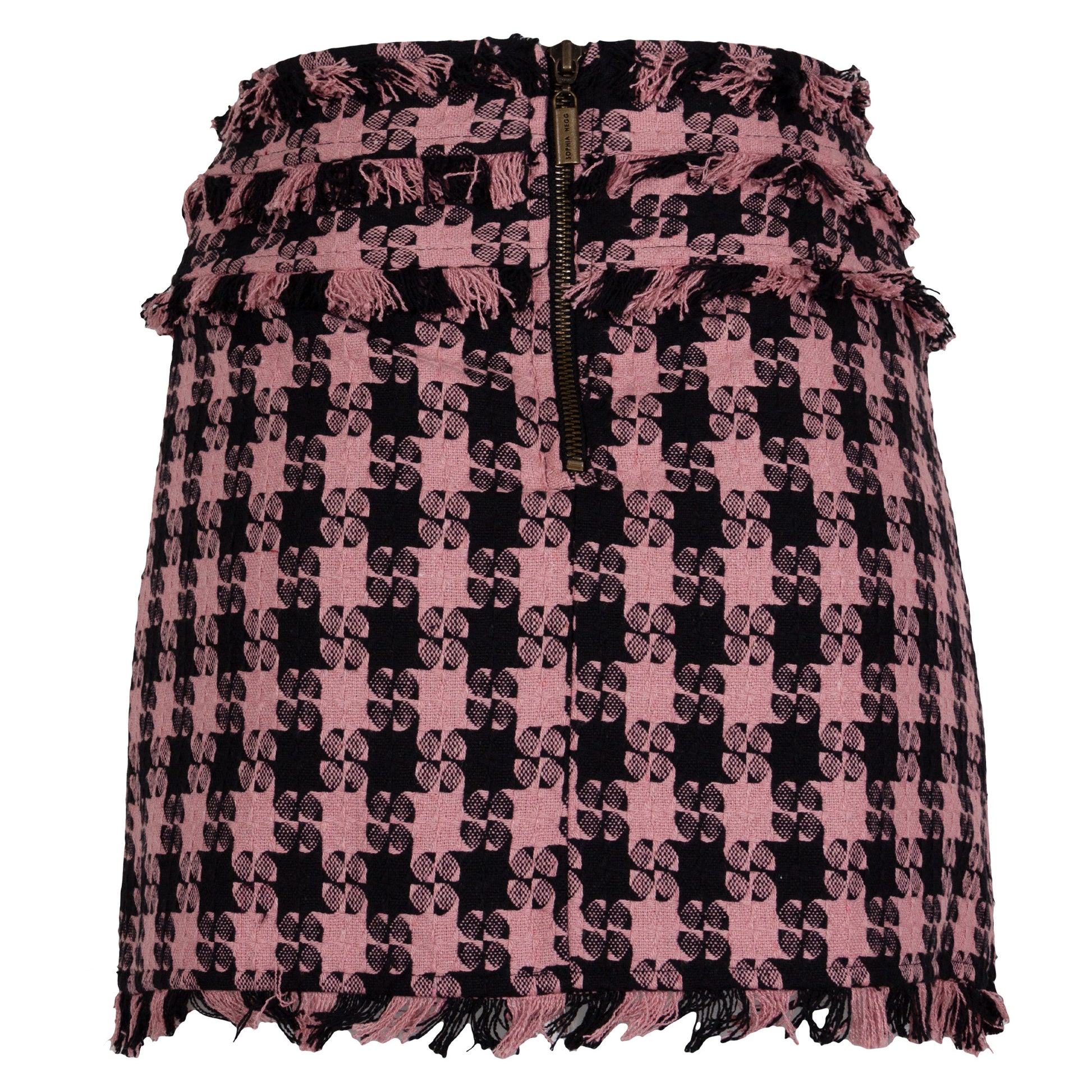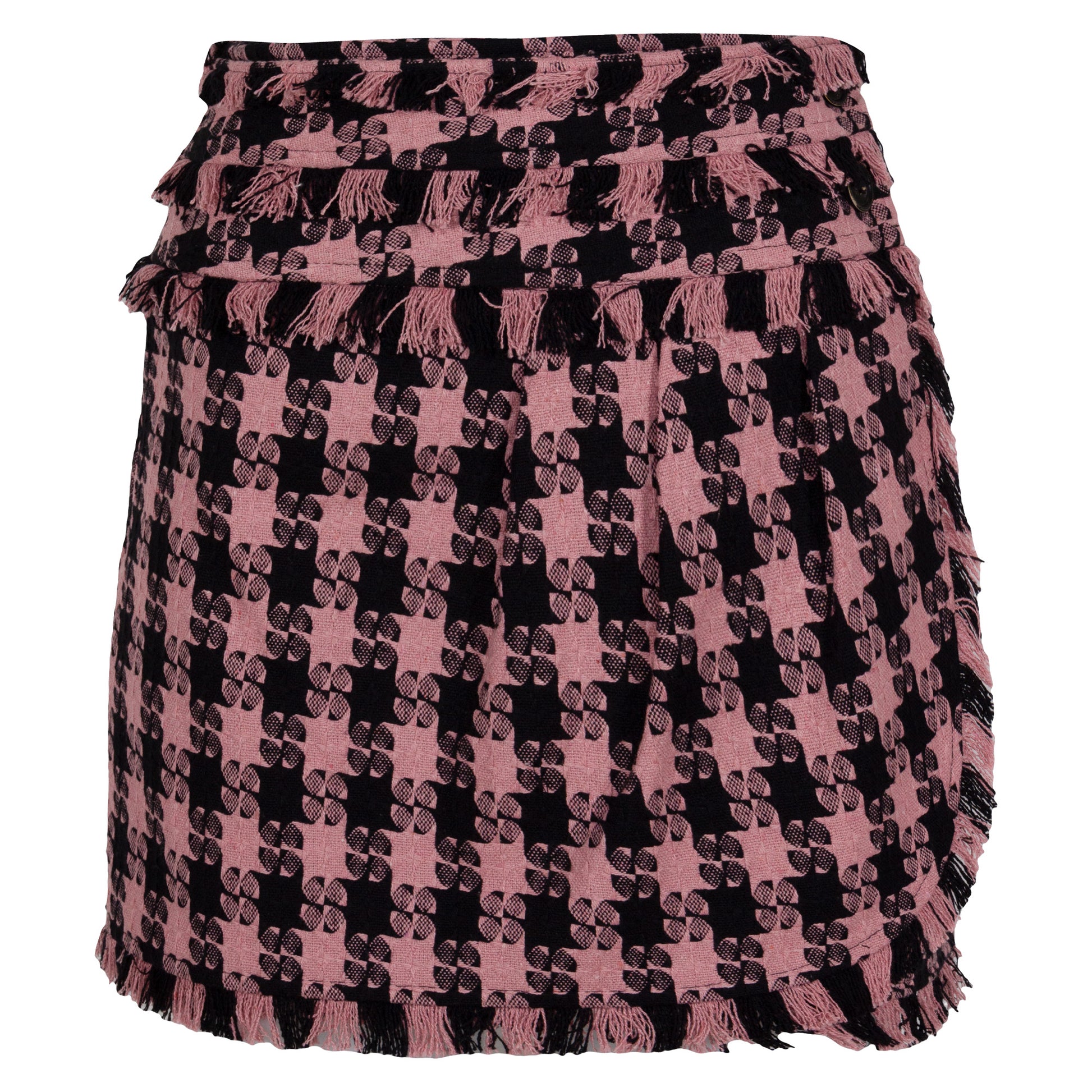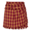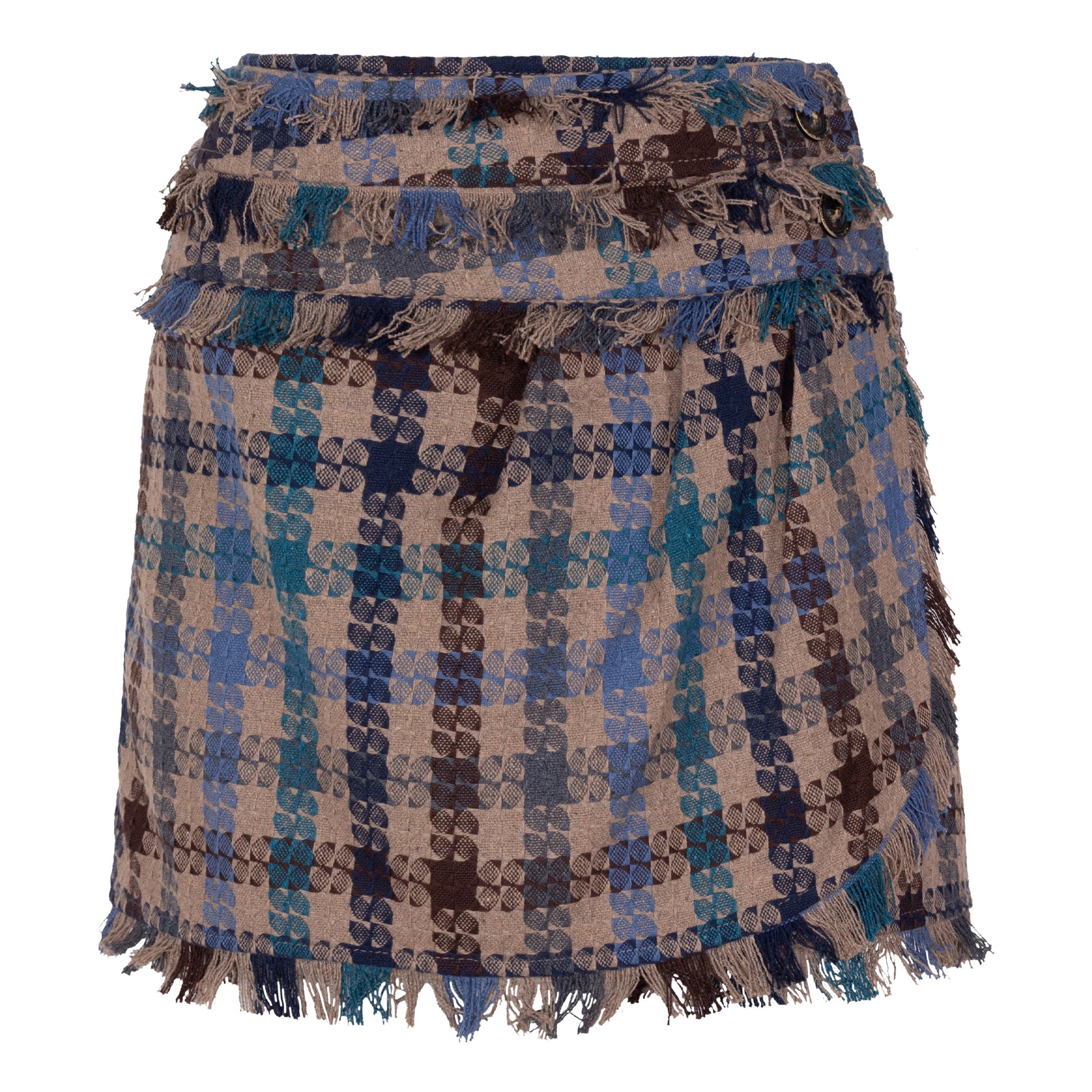 Saia curta em tecido estampado. Apresenta pala no cós com detalhes de franjas, assim como na barra e no corpo da peça.