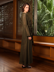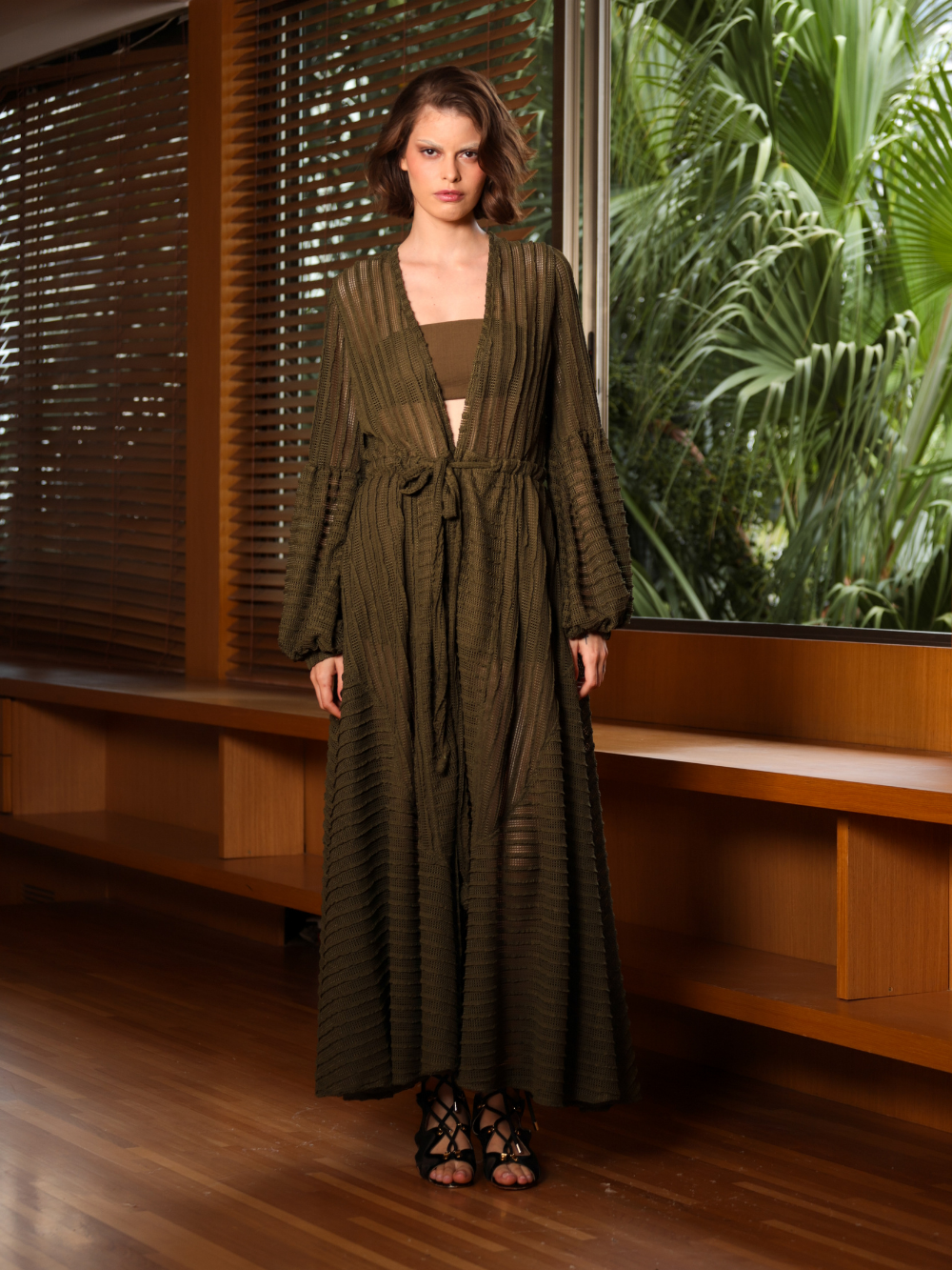 Vestido de comprimento longo, com decote em V profundo e mangas longas amplas, finalizadas com leve volume nos punhos. Possui cintura ajustável por amarração. A saia é fluida e ampla.