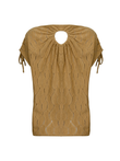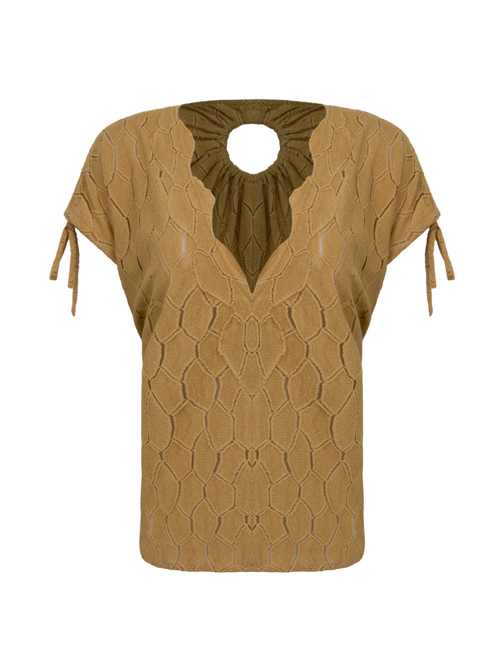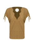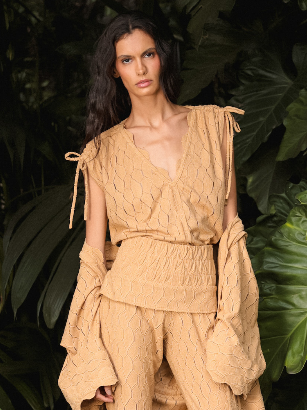 Regata de modelagem solta, com decote em V na parte frontal. Possui alças largas com amarração ajustável nos ombros. Nas costas, apresenta abertura central em formato de gota, com leve franzido na gola, que cria volume no caimento.