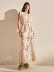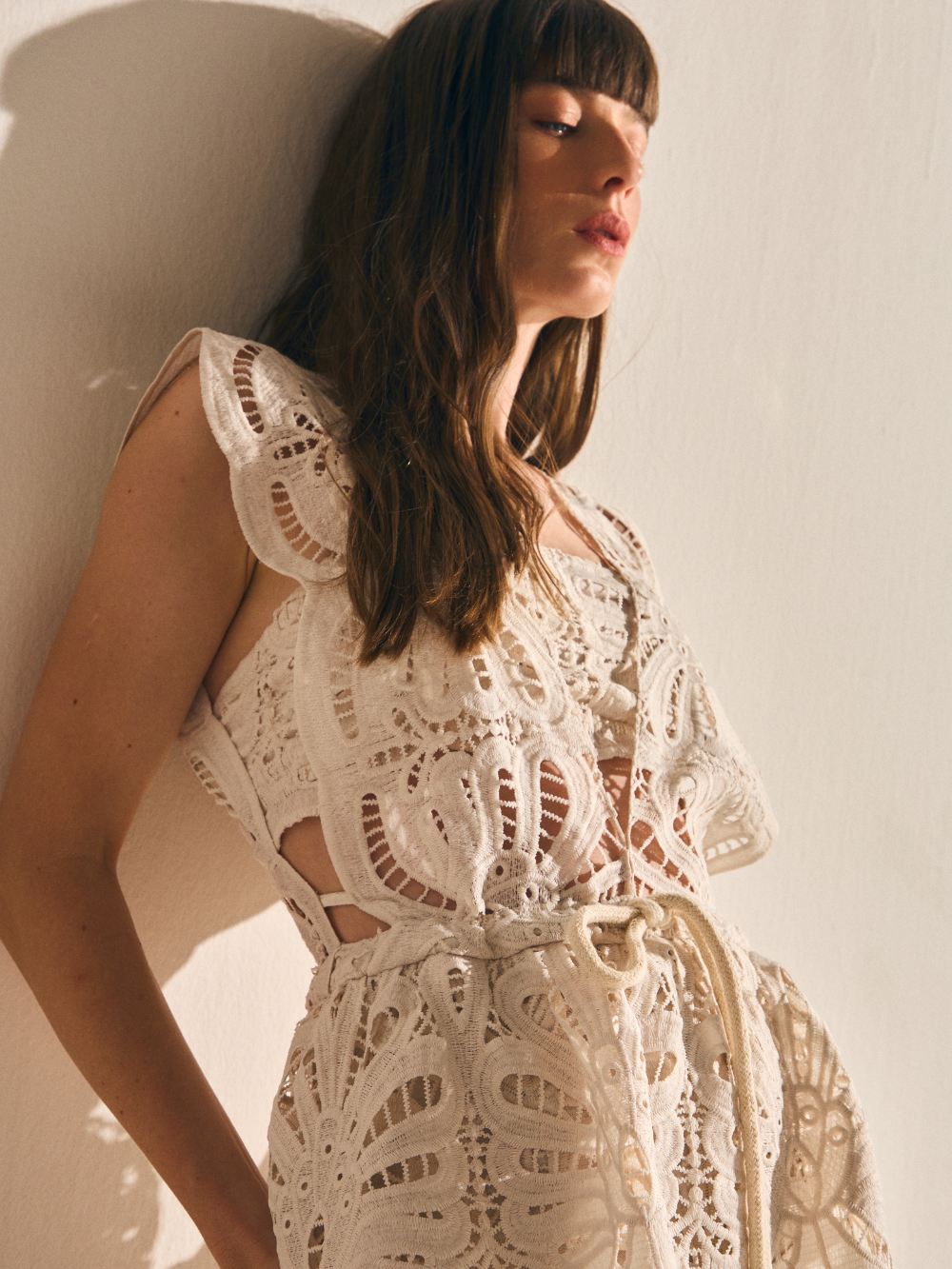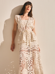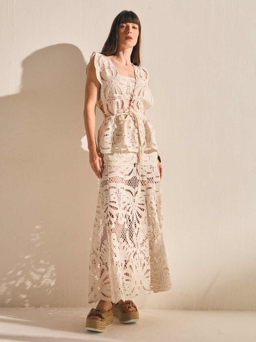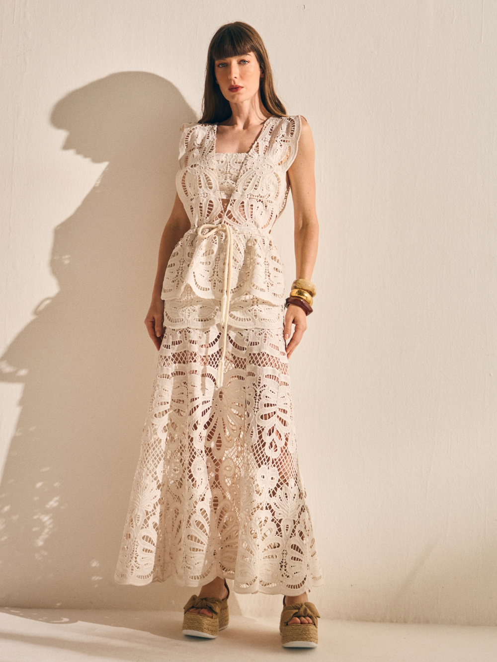 Vestido longo em renda estruturada, sem mangas, com ombros marcados, decote profundo e cordão na cintura para acinturar a peça. Acompanha top faixa e possui transparência leve na parte inferior da saia.