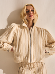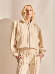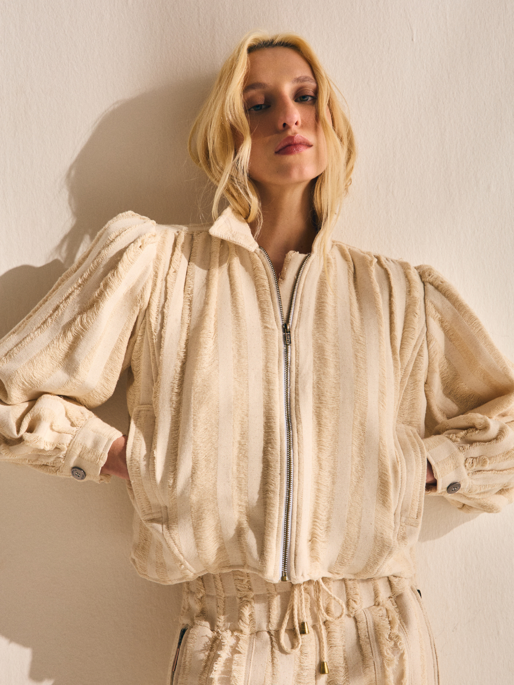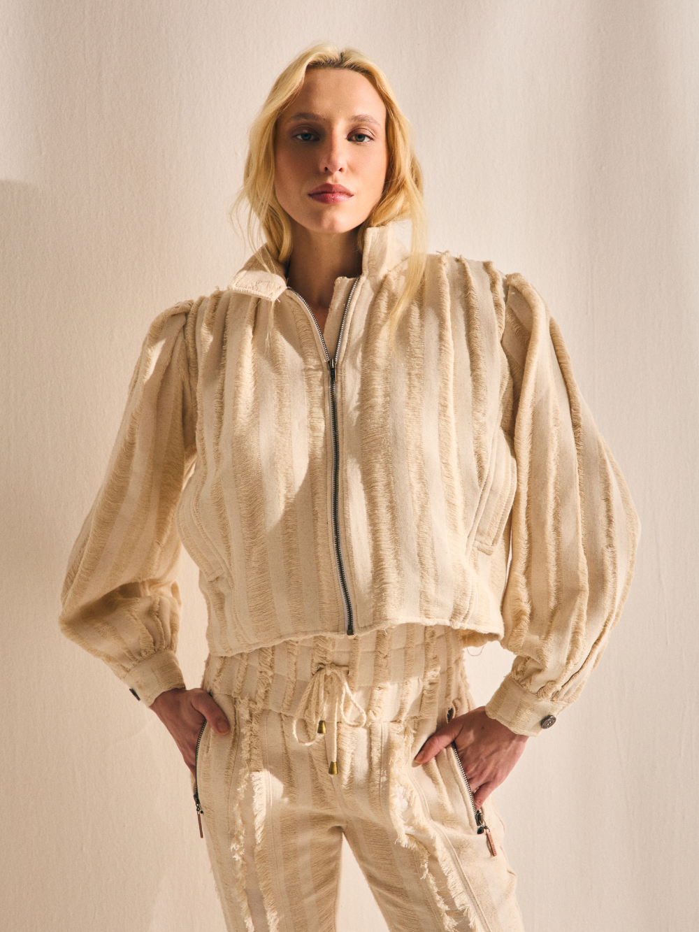 Jaqueta em tecido encorpado com textura vertical e gola alta com botão centralizado. Mangas longas bufantes com punho ajustado.