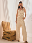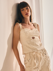 Regata estruturada em tecido tipo sarja com bordado floral. Possui alças largas, decote coração e recorte frontal em formato de gota. Fechamento com zíper nas costas.