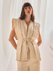 Colete em modelo amplo e estruturado nos ombros. A peça é confeccionada em tecido encorpado com bordados florais. O fechamento é feito por cinto trançado com botões forrados, marcando delicadamente a cintura.